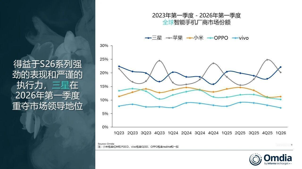 2026年一季度全球智能手机出货量份额TOP5 三星,22% 苹果,20% 小米,11% OPPO,10% vivo,7% Omdia预计今年全年全球智能手机出货量将同比下跌约15%。