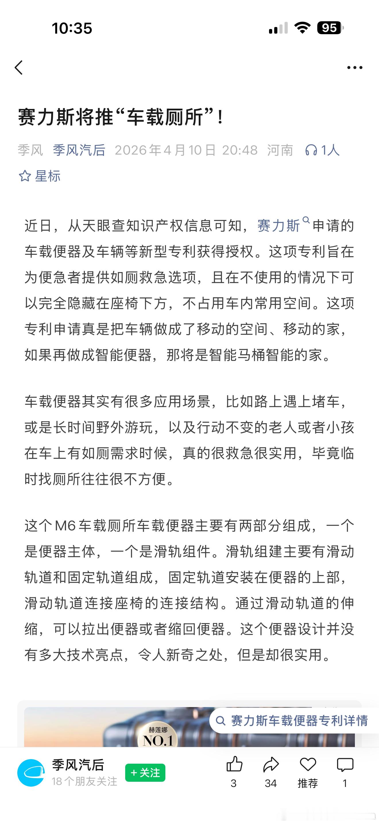 近期,赛力斯申请的车载便器等新型专利获得授权。“车载厕所”要来了??