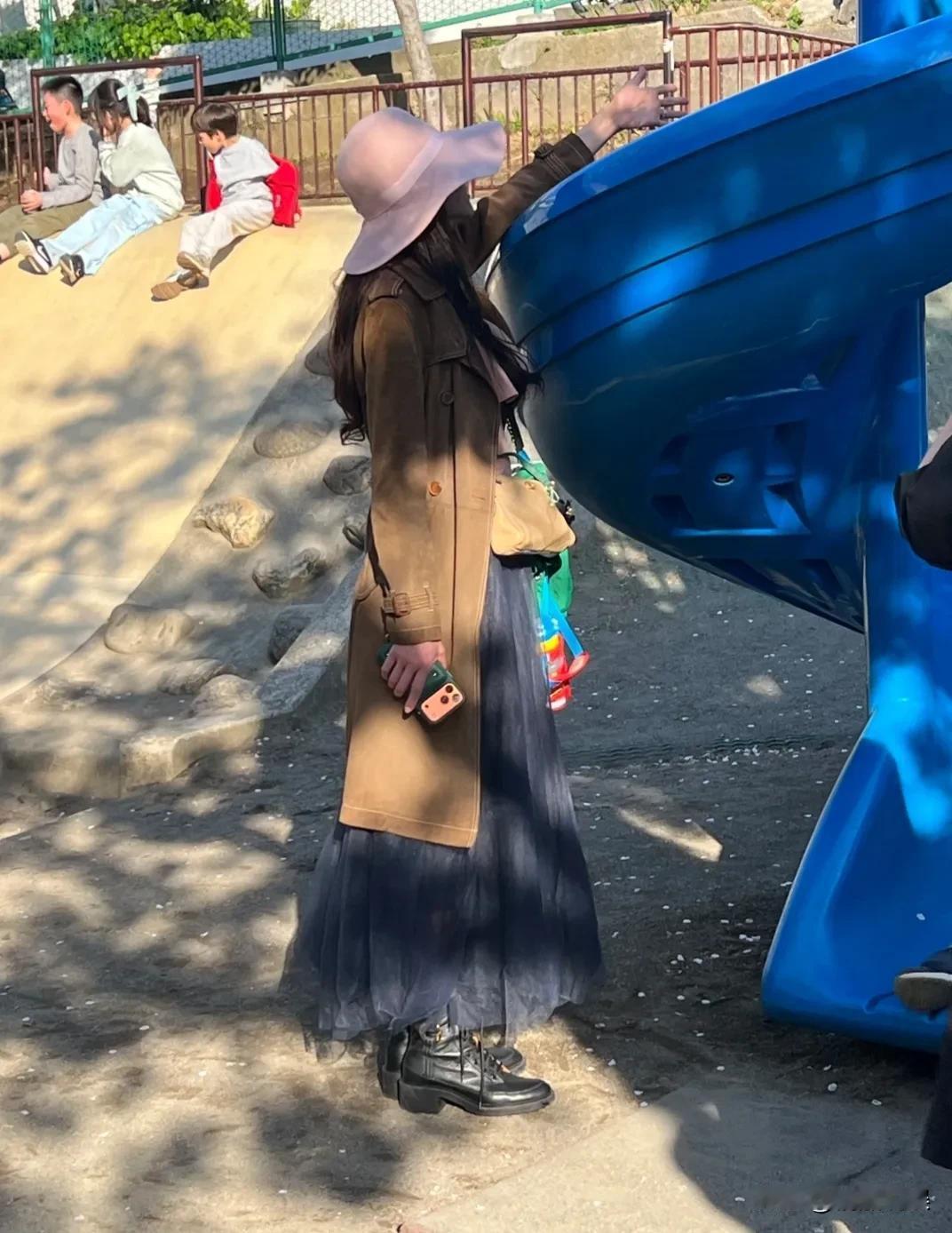 周末,林志玲在日本,被网友偶遇带娃在儿童公园溜娃。 她穿着一件棕色的呢大衣3配纱裙,戴着紫粉色的遮阳帽,背着自己的小挎包,还随身背着一个儿童水壶。 装备齐全啊,看来她没少带娃,是一个熟练称职的奶妈。 其实看照片,她生图的状态,看着比红毯还好,更自然,眼神清亮,脸也很紧致,除了颈纹有点显年纪,本人看着是真的年轻,完全不像五十出头的人,状态远胜同龄人。