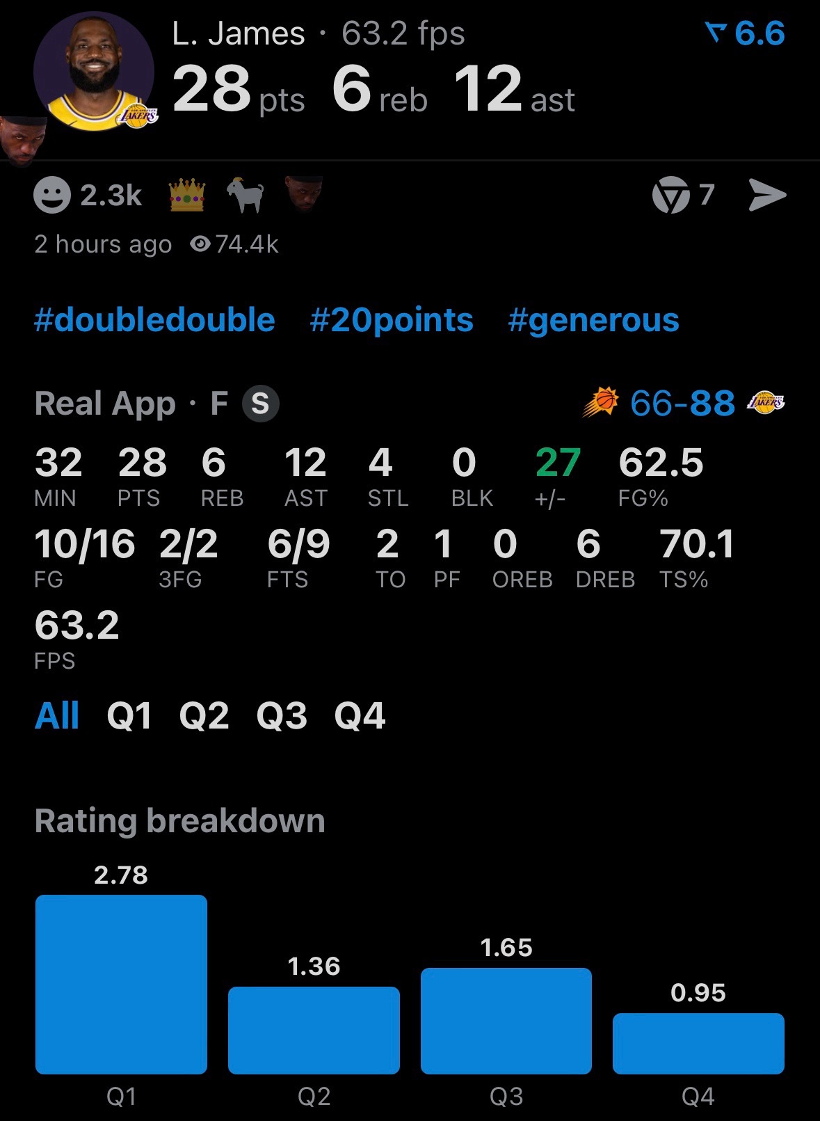 詹姆斯里程碑之夜打卡下班!本场比赛出战32分钟,16投10中,三分2中2,得到28分6板12助攻4抢断。正负值+27!