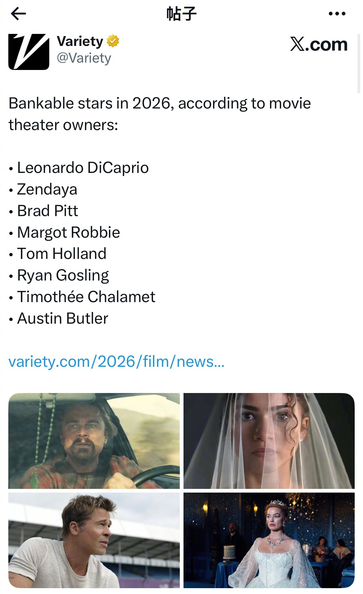 • Leonardo DiCaprio —— 莱昂纳多·迪卡普里奥• Zendaya —— 赞达亚• Brad Pitt —— 布拉德·皮特• Margot Robbie —— 玛格特·罗比• Tom Holland —— 汤姆·赫兰德• Ryan Gosling —— 瑞恩·高斯林• Timothée Chalamet —— 提莫西·查拉梅• Austin Butler —— 奥斯汀·巴特勒