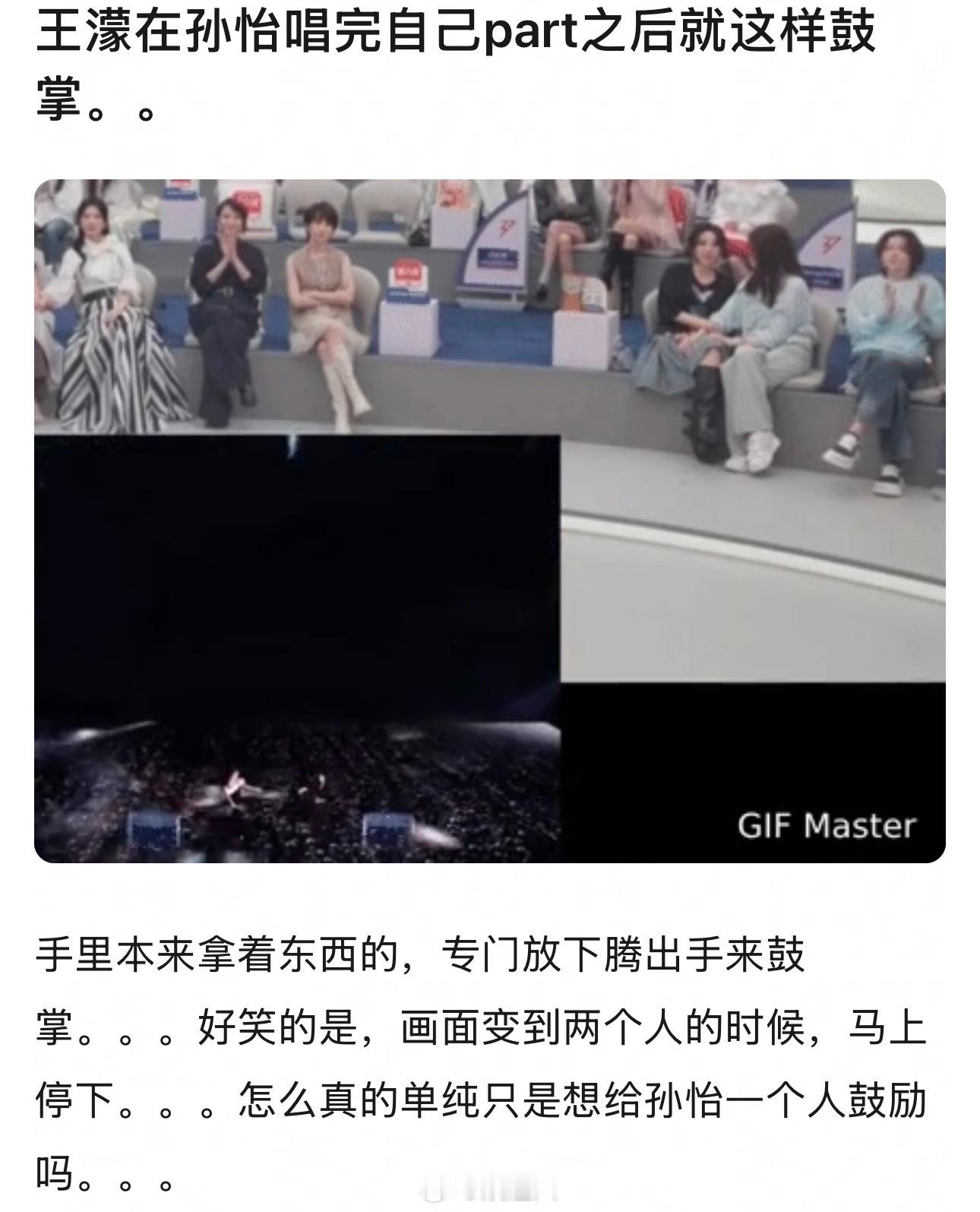 王濛孙怡好嗑浪姐版傲慢与偏见 有网友总计了王濛孙怡昨晚的互动,完全是浪姐版傲慢与偏见孙怡唱歌时王濛手里本来拿着东西的,专门放下腾出手来鼓掌;最后结束孙怡回到观察区,王濛鼓着掌走过去,但没有再靠近去说一下安慰的话,明明既认可她的表现又对结果感到不忿。。最后只是甩手走开。。是因为她身边人已经太多,不用再多自己一个了吗。。两人真有种诡异般的好嗑谁懂…王濛 搞体育的最见不得这种