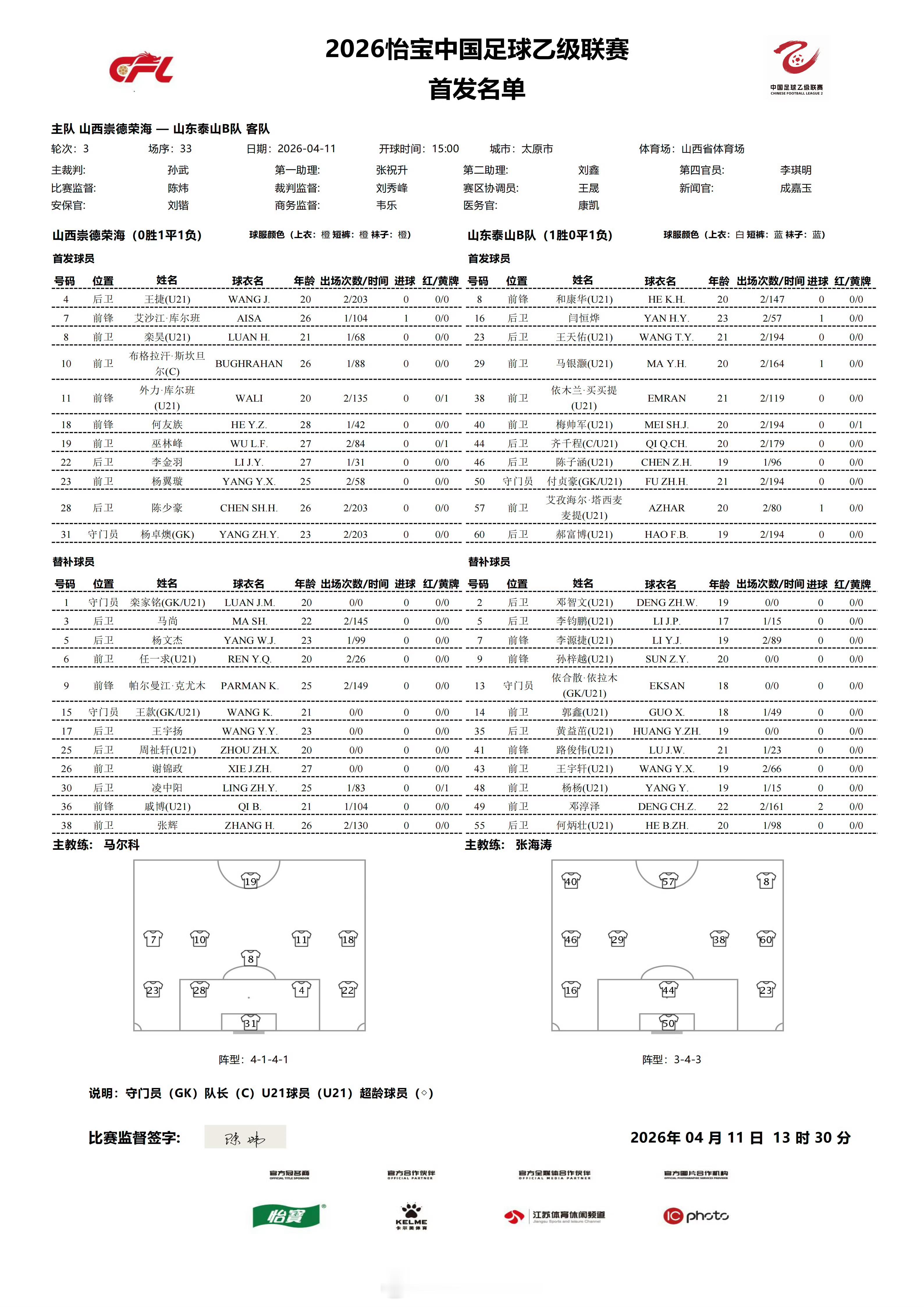 中乙联赛第三轮,山西崇德荣海VS山东泰山B队,首发阵容出炉。