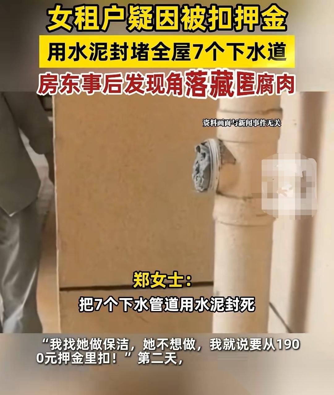炸裂!租户退房留“水泥封尸”地狱房!马桶被灌三分之二水泥,房东当场崩溃:这是人干的? 🔥 故事开篇:2000元买个“哑巴亏”,这种让收租佬们一看就心律失常的极端狠活儿,居然真在现实中上演了。推开门一看,屋里的下水系统全瘫痪了。 洗手台往外狂吐脏水,满地汪着黑水。 最让人窒息的是那个连通主管道的排污口。里面被人用硬邦邦的灰黑色水泥封得死死的。 房东起初以为只是管道堵了,花钱请师傅上门疏通,结果这钱全打了水漂。师傅挖开一看才发现,这哪是什么污垢,分明是有人蓄意搞破坏。 干这事的人早跑没影了,铁了心玩失踪。 看客们一看这阵势,都在猜。 八成是退租的时候,两边为了费用结下深仇大恨。 有些人看着不仅不同情,反倒觉得挺解气。他们满脑子“受害者有罪论”,一口咬定肯定是主家胡乱扣钱在先,把老实人逼急了才下了黑手。 但顺着这思路叫好,真挺可怕的。 咱们从结果倒推这笔账。 退一万步讲,就算房东真挑刺扣了你几个月的房租,你找社区调解、去投诉、走法律程序,哪条路不能走? 你非得抄起瓦刀和水泥去泄愤。 这下好了,整件事的性质彻底反转了。 按常识,故意毁坏公私财物,损失一旦超过五千块,就够得上刑事立案标准。你想想,砸穿排污主管、全屋重新走管线、再重做防水,这套大修算下来,得是原来那点争议费用的多少倍? 这根本不是什么替天行道的反击。 这就是彻头彻尾的法盲。 打着遭遇不公的旗号,干着更没下限的勾当。为了争那口微不足道的恶气,硬是把原本占理的自己,活活作成了涉嫌破坏财物的犯罪者。 一码归一码。 拿违法的行径去报复别人的小偷小摸,实在是蠢到家了。 拿砸穿底线的方式去惩治对方,最后吃死亏、带银手镯的,只能是你自己。 对此,你怎么看?> ❌ 消息流出现异常