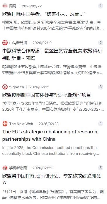 欧盟正式官宣了一个让全球科研界震动的决定: 从2026年起,将中国科研机构全面排除在耗资955亿欧元的“地平线欧洲”计划核心领域之外。人工智能、量子科技、半导体、生物医药等决定未来的赛道一夜关门,连欧洲学者与中方合作都要被连带审查,全球科技圈一片哗然。 麻烦看官老爷们右上角点击一下“关注”,方便您进行讨论和分享,感谢您的支持! 2025年底,欧盟委员会的一纸草案悄然流传于布鲁塞尔的走廊之间,到2026年初正式落地,整个全球科研圈都感受到了一阵寒意。欧盟正式宣布,自2026年起,中国科研机构将被全面排除在耗资955亿欧元的“地平线欧洲”计划核心领域之外。这不是一个普通的政策调整,而是一场精心布局的科技切割。要知道,“地平线欧洲”是欧盟有史以来规模最大的研究与创新计划,覆盖2021至2027年,总预算高达955亿欧元,被视为欧洲科研的旗舰工程。 欧盟这次出手,瞄准的不是边缘地带,而是决定未来国运的核心赛道。人工智能、量子科技、半导体、生物医药——这些被称为“第四次工业革命”核心引擎的领域,一夜之间对中国关上大门。换句话说,以前中国科学家还能在这些前沿项目里申请经费、参与合作,现在这条路彻底断了。不仅如此,连欧洲学者如果打算跟中方搞合作,都得接受连带审查,甚至一些压根不敏感的普通项目也会被卡住。欧盟的说法是,这样做是为了“研究安全”和“防止技术泄露”。但明眼人都看得出来,这套说辞不过是托词,真正的意图是在科技赛道上竖起一堵墙。 事情的起因要追溯到2025年底。据“科学|商业”网站2025年11月披露的草案,欧盟研究与创新计划2026年工作方案中明确写入:中国设立的法人实体将被禁止参与第1集群(健康)、第3集群(社会与民事安全)及第4集群(数字、工业与太空)的项目征集。这三个集群恰好覆盖了AI、半导体、量子、生物技术等最敏感的领域。更值得注意的是,被称为“国防七子”的中国高校联盟被彻底排除在计划之外。这意味着,即便是一些基础性的研究合作,也被政治化地一刀切断了。 欧盟在操作手法上可谓滴水不漏。他们专门用五页篇幅的条款来针对中国设置限制,细致到令人咋舌。比如,即使申请者不是中国人,只要其合作伙伴机构跟中国沾边,也必须提供证明、接受审查。这种“连坐式”的审查机制,实际上堵死了任何绕道合作的可能。有欧盟官员在内部研讨会上直言:“我们正处于一个经济和地缘政治的关键时期,必须关注我们的行动以及合作对象。”知识产权保护也被搬了出来,成为限制的又一借口。但英国肯特大学的社会学家张乔伊当场戳穿了这个谎言:知识产权盗窃更多发生在商业公司之间,而不是那些做前沿研究的基础科学家身上。欧盟这步棋,显然醉翁之意不在酒。 将时间线拉长一点看,这个转变绝非一夜之间发生的。在上一个资助周期,也就是2014到2020年,地平线2020计划的预算大约是800亿欧元,当时美国和中国是非欧盟参与者中排名前两位的国家。中欧科研合作曾经有过相当辉煌的时期,中国空间科学学会理事长吴季二十多年前主导的中欧双星卫星任务,堪称里程碑式的合作典范。但那样的时代正在成为过去式。吴季本人也不无感慨地表示,此类合作如今正在走向终结,中欧最后的联合空间科学项目——“微笑”卫星,计划于2026年4月发射,之后恐怕很难再有新的合作了。 有美国学者评论说,欧盟这次完全是照搬了美国的“小院高墙”逻辑,标志着中欧在科技领域从伙伴关系转向战略竞争。美国智库昆西研究所高级研究员丹尼斯·西蒙一针见血地指出,这种排除不仅意味着双方关系质变,长期来看还会带来一系列负面后果:欧盟吸引中国人才的机会将减少,中国接触欧洲前沿实验室的渠道被切断,全球科研格局会变得更加碎片化。听起来像是在说别人,但仔细一想,欧盟自己恐怕也讨不到什么好。 实际上,这项禁令对中国科研界的实际伤害可能相当有限。宁波诺丁汉大学的科技政策专家曹聪直言,在地缘政治日益塑造研究关系的时代,欧盟的政策转向并不令人意外,但对中国的冲击并没有想象中那么大。为什么?因为中国已经走到了一个阶段——在很多前沿领域,中国正在从追赶者变成领跑者。数据显示,中国已成为全球最大的AI专利持有国,占全球总量的60%;在6G领域,中国专利数量同样位居全球首位,占比超过40%;在量子计算、量子通信和量子传感方面,中国在科学产出份额和专利数量上均遥遥领先其他国家。 也就是说,欧盟锁上的那些门,中国自己早就打开了。甚至可以说,这道禁令更像是欧盟在自家门口竖起的一块“禁止入内”的牌子,可惜禁的是他们自己。
