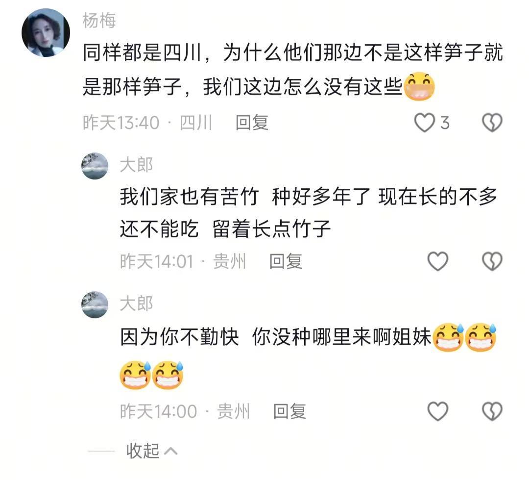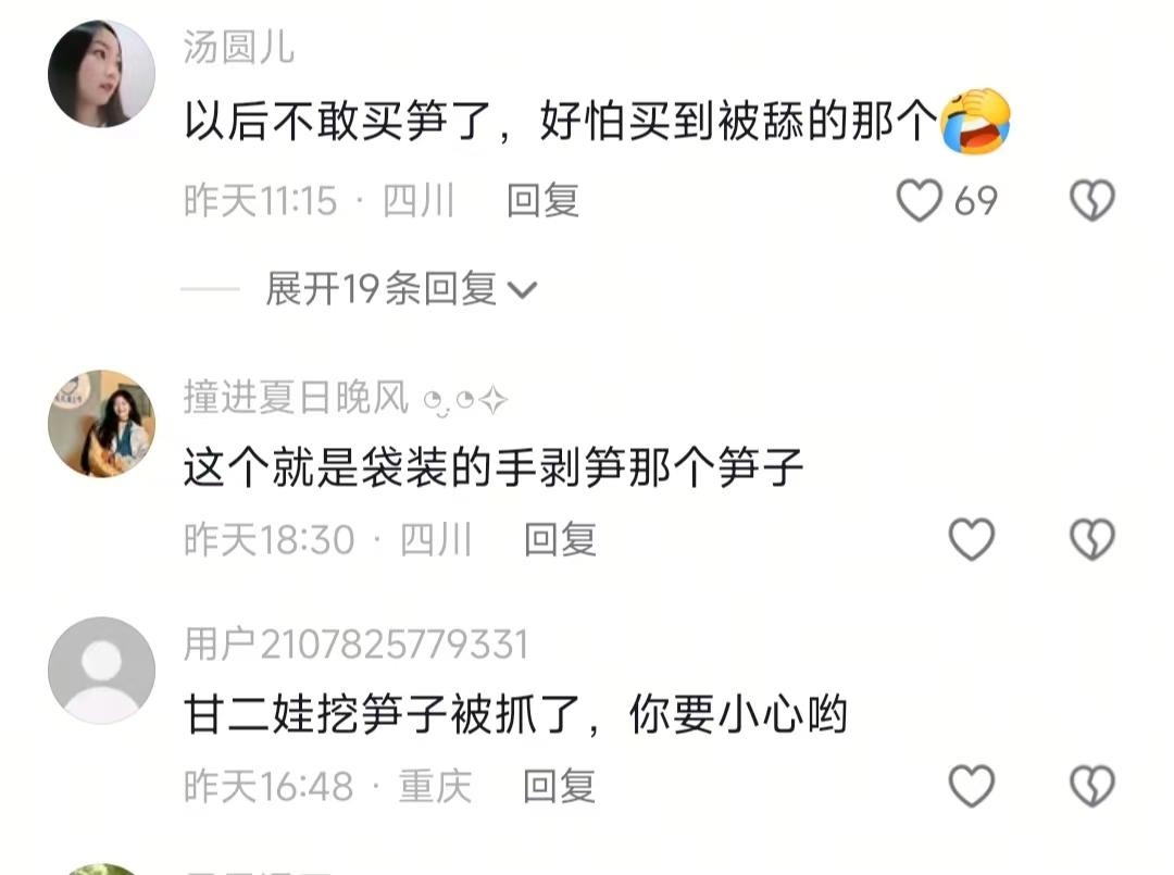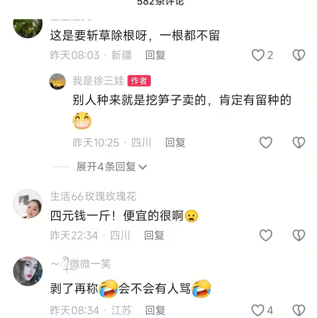 现在全网最烦恼的男人就是徐三娃了吧! 不是因为挖笋卖不出去,也不是因为摆摊被城管赶 而是因为舔了一口笋,现在全网都在怕买到他舔过的那根。真服了! 谁懂啊!本来今天上班摸鱼想刷个农村视频解压,结果刷到徐三娃挖雷竹笋的那条,直接被评论区笑到喷饭。本来以为就是平平无奇的摆摊日常,结果一个舔笋的动作,直接让评论区炸了锅,现在全网都在怕买到被他舔过的那根笋。 说真的,徐三娃这挖笋速度是真给力啊,步行十几分钟到竹地,麻溜的就找到第一根笋,挖出来剥了点皮直接舔了一口,说还是甜的。我晕,当时我手里的奶茶都差点洒了。然后他就可劲儿挖,挖了17根,称了下14.8斤,扛着就走,还说挖笋解压但是有点累。 然后他骑三轮车二十多分钟到镇上菜市场,找了个空地就摆上了,卖6块钱一斤。说真的,这速度我是真佩服,不到俩小时就卖得差不多了,遇到零头还直接抹掉,太巴适了。本来我还羡慕得不行,说这钱也太好赚了吧。 结果突然想起我去年摆地摊卖自家橘子的事,蹲了一下午才卖出去三斤,还被人嫌贵,郁闷到直接收摊回家,谁懂这种落差啊?原来不是所有地摊都能这么好卖,人家这是占了新鲜和季节的便宜啊。 结果评论区直接吵成了一锅粥。有人说以后不敢买笋了,怕买到被舔的那个;有人说他这是斩草除根一根都不留;还有四川网友疑惑为啥自己那边没有这种笋。徐三娃也回复了,说种来就是卖的,肯定有留种的。 之前看到有人说,世间没有绝对的干净,也没有绝对的对错,你用城市的标准去要求农村的地摊,本身就有点强人所难。不是吗?有人觉得不卫生,有人觉得这才是真实的生活,谁也说服不了谁。 总之,我想说的是,要是真的特别介意这种接地气的操作,就去超市买包装好的农产品;要是喜欢这种新鲜现挖的,买回去多洗几遍,用开水焯一下就完事了。你说是吧?