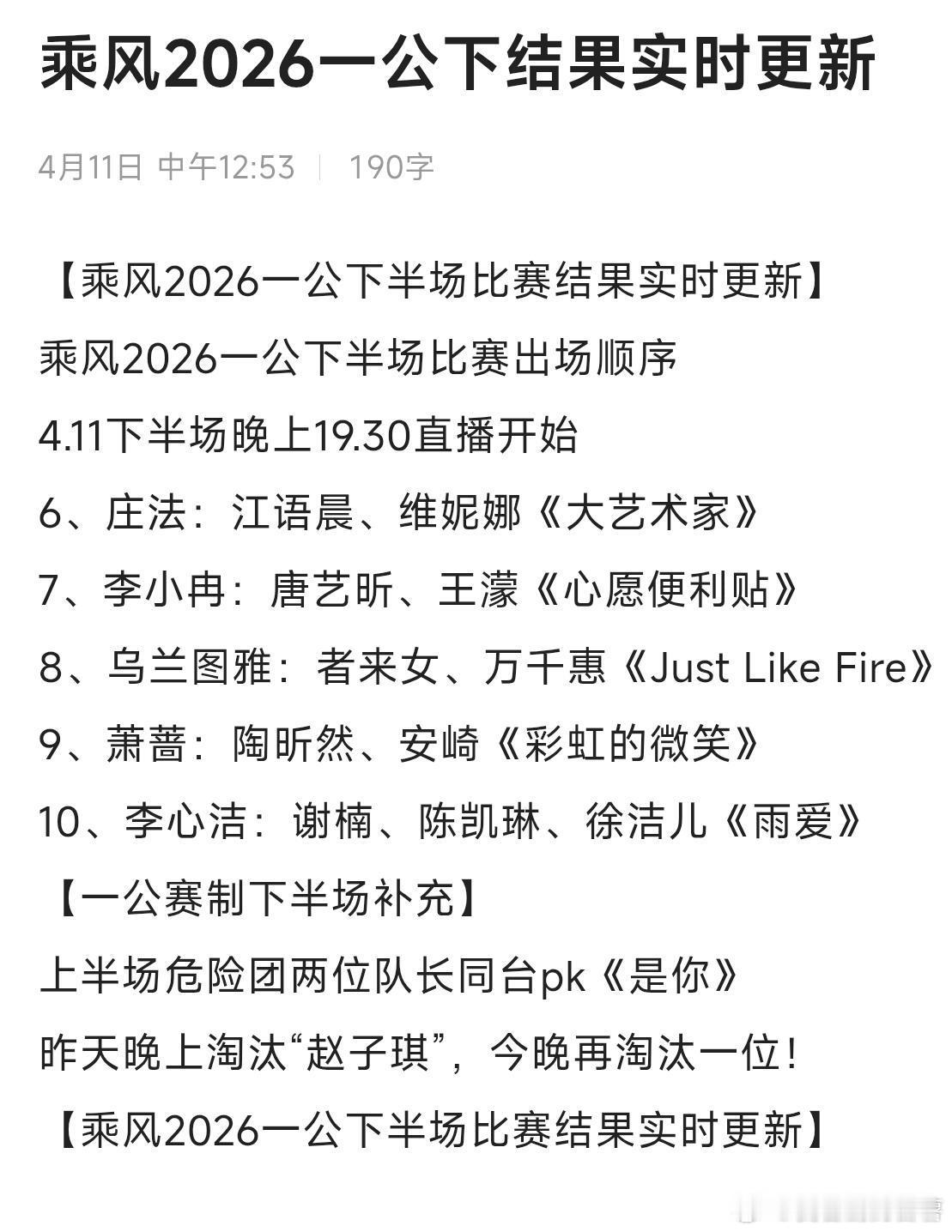 4.11下半场今天晚上19.30直播开始!在芒果tv6、庄法:江语晨、维妮娜《大艺术家》7、李小冉:唐艺昕、王濛《心愿便利贴》8、乌兰图雅:者来女、万千惠《Just Like Fire》9、萧蔷:陶昕然、安崎《彩虹的微笑》10、李心洁:谢楠、陈凯琳、徐洁儿《雨爱》【一公赛制下半场补充】上半场危险团两位队长同台pk《是你》昨天晚上淘汰“赵子琪”,今晚再淘汰一位【乘风2026一公下半场比赛结果实时更新】