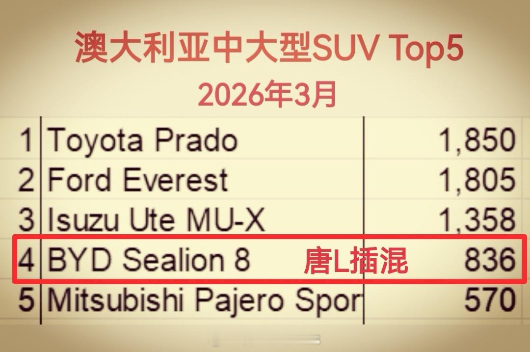 3月份交付836台!比亚迪 唐L插混“杀入”澳大利亚中大型SUV Top5 !