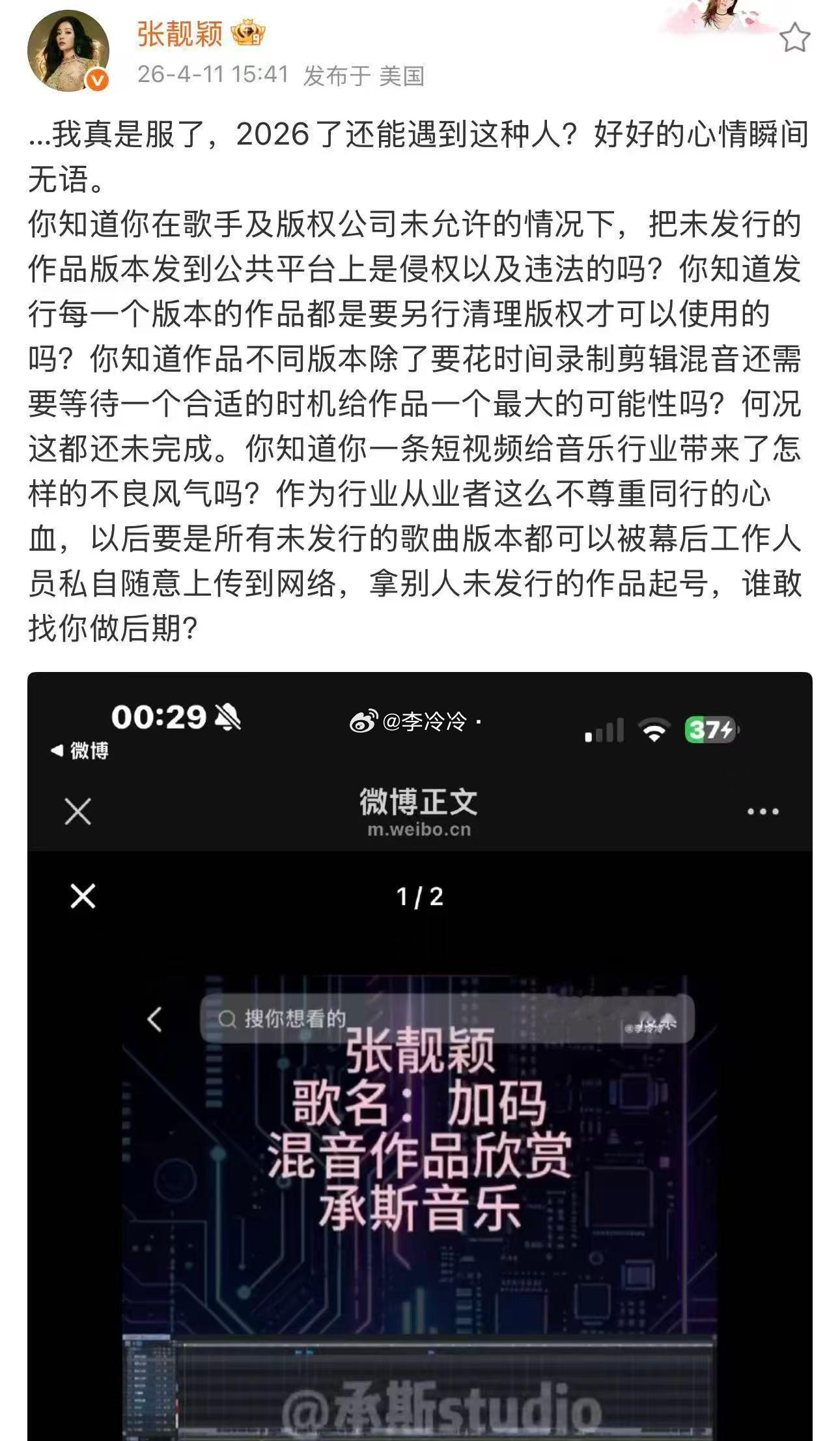张靓颖未发行作品版本泄露张靓颖加码未发行版本泄露 业内人士更该守行业底线,私自泄露未发行音源既违约又侵权。张靓颖发声不仅是为自己,更是在为整个音乐行业的版权意识发声,必须支持!