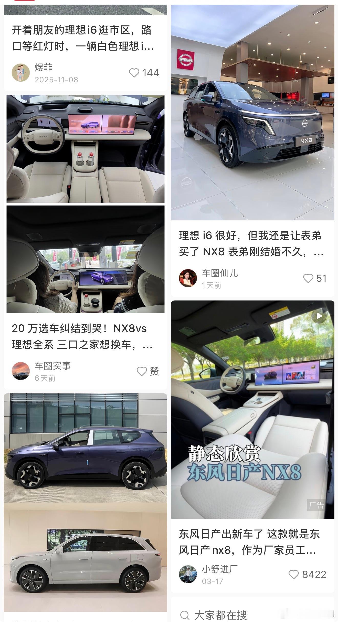 隔壁平台出现大量 东风日产 NX8 对比理想 i6 的动态。