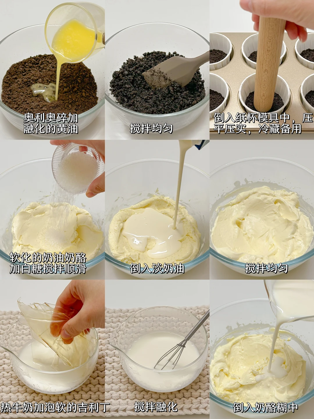1️⃣奥利奥碎加融化的黄油搅拌均匀,倒入纸杯模具中压平实,冰箱冷藏备用。