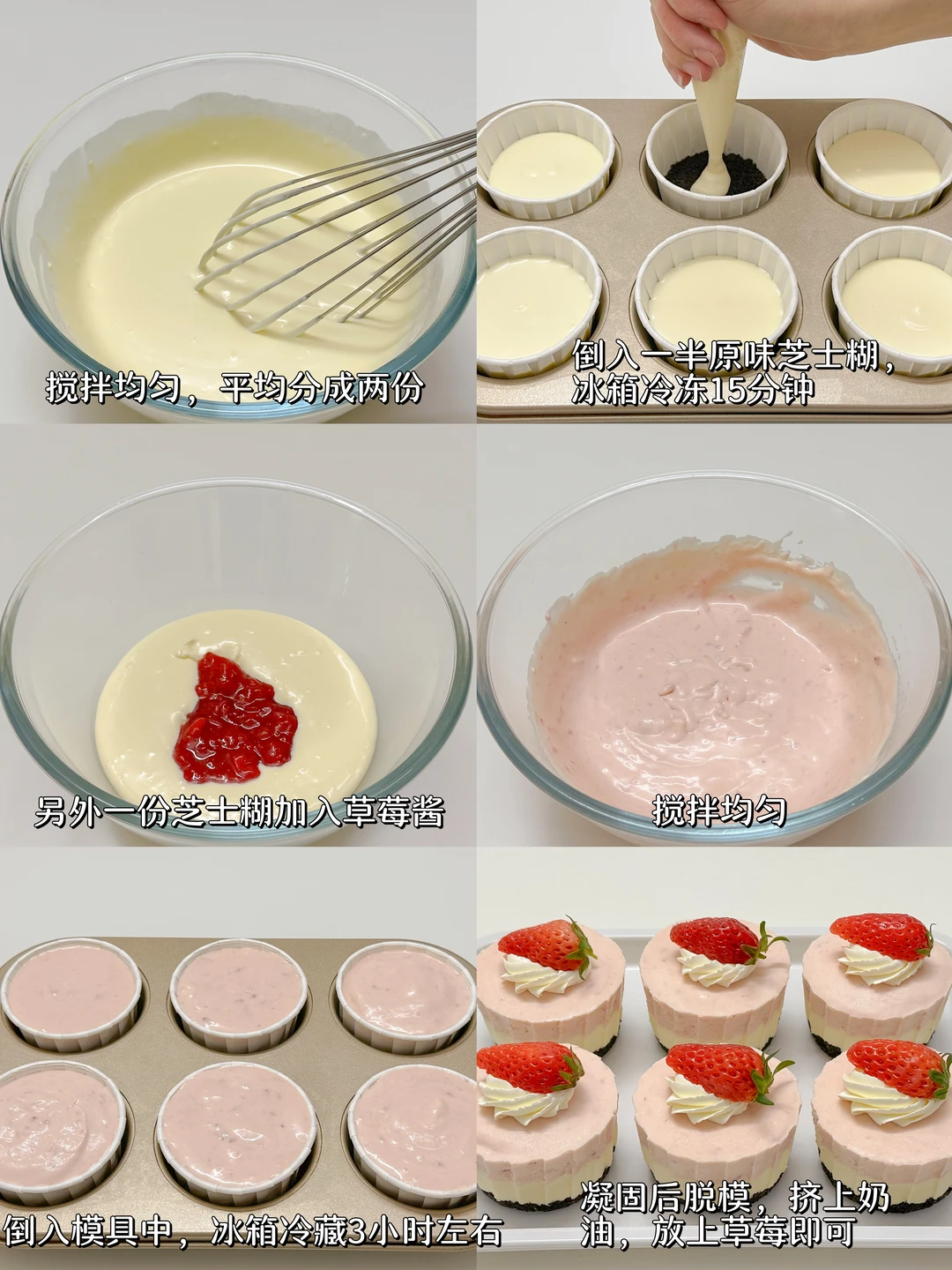 3️⃣将一半原味芝士糊挤入纸杯5分满,冰箱冷冻15分钟;另外一份芝士糊加入草莓酱搅拌均匀,挤满纸杯中,冰箱冷藏3小时左右,凝固后脱模,挤上奶油,放上草莓装饰即可。