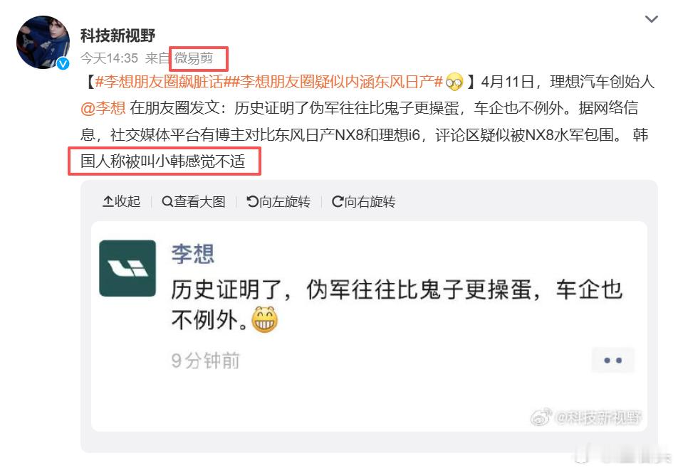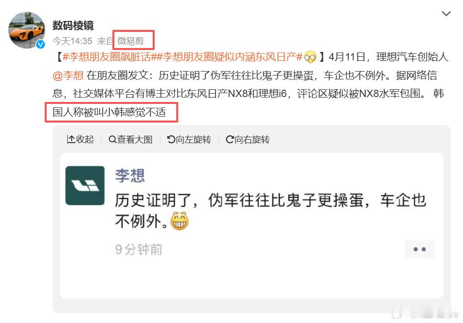 李想和“韩国人称被叫小韩感觉不适”有啥关系?而且都是来自微易剪,这是在做任务吧?