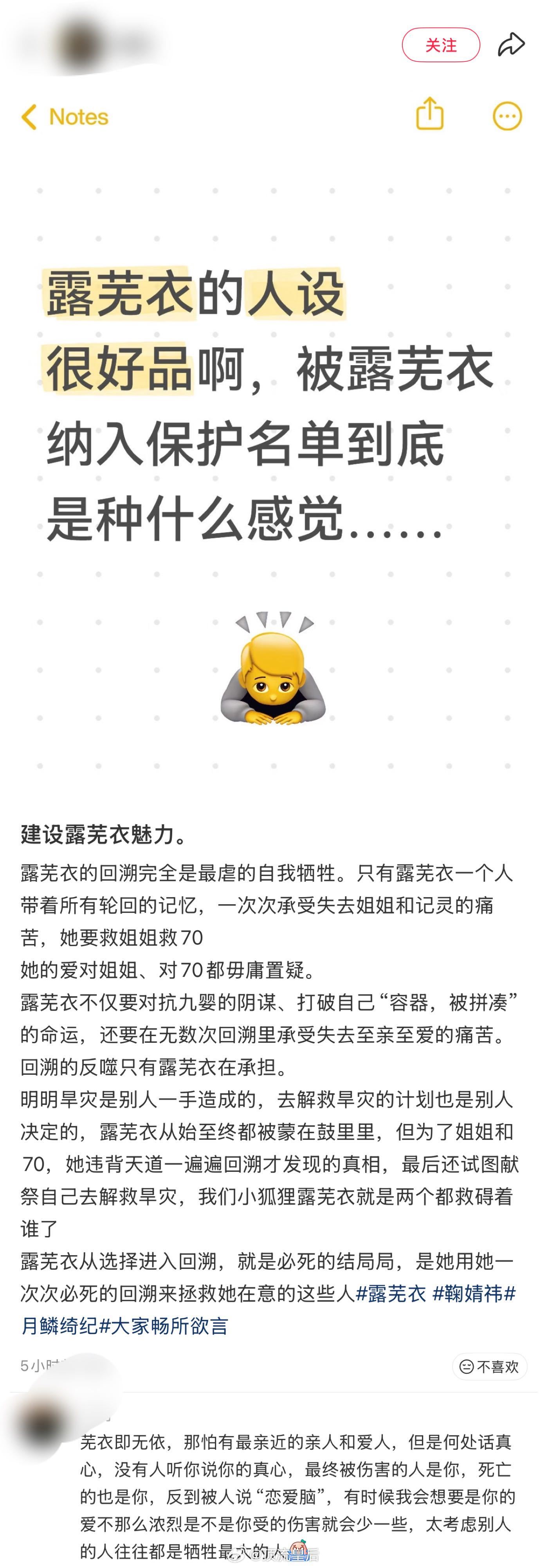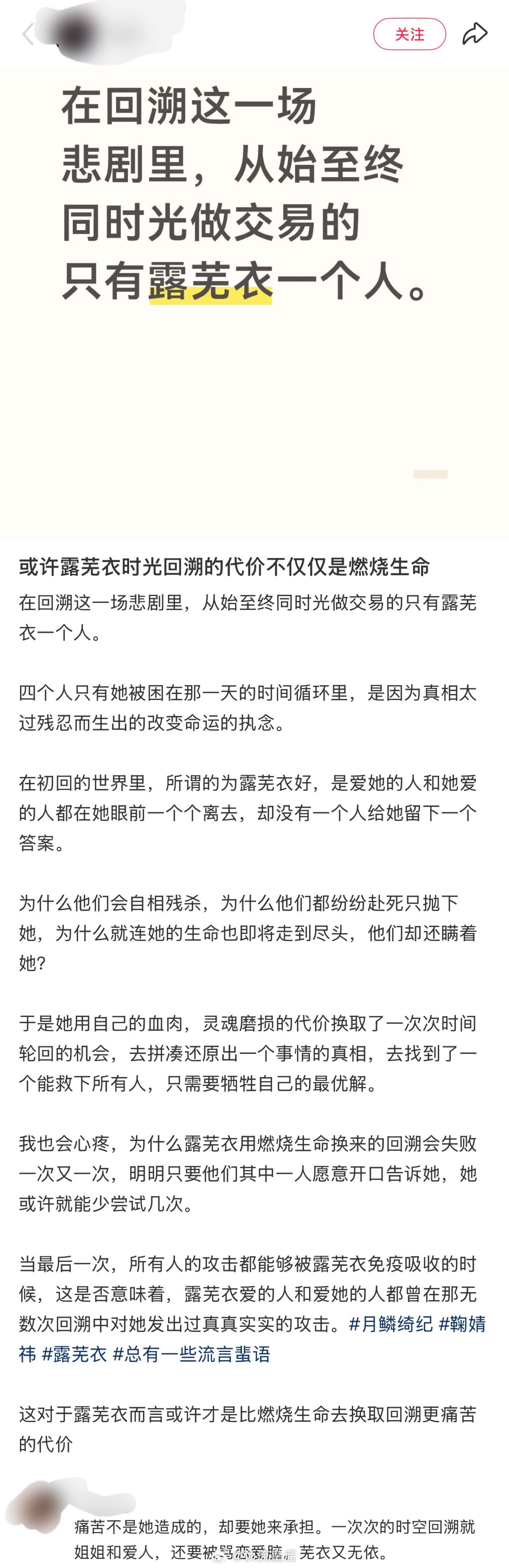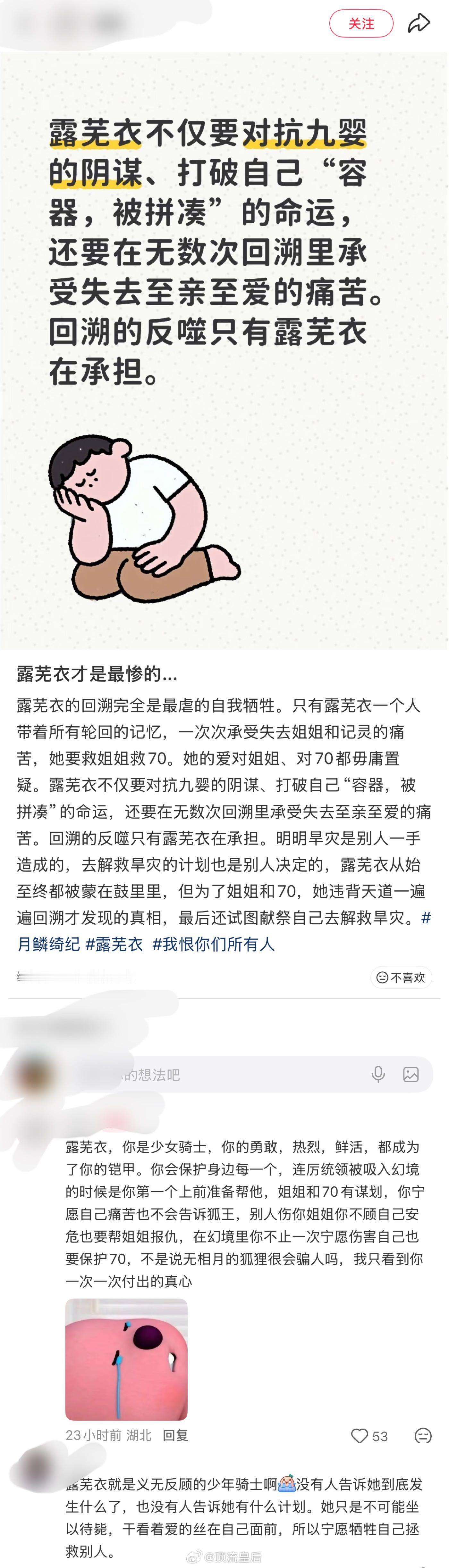 讲真,追了这么久月鳞,毫无疑问露芜衣就是少女骑士啊!回溯是因为旱灾,是为了救至亲至爱,她用血肉和灵魂为代价一次次回溯,现在却被恶意引导恶意中伤,不懂为什么要对一只狐的恶意这么大,这对吗……