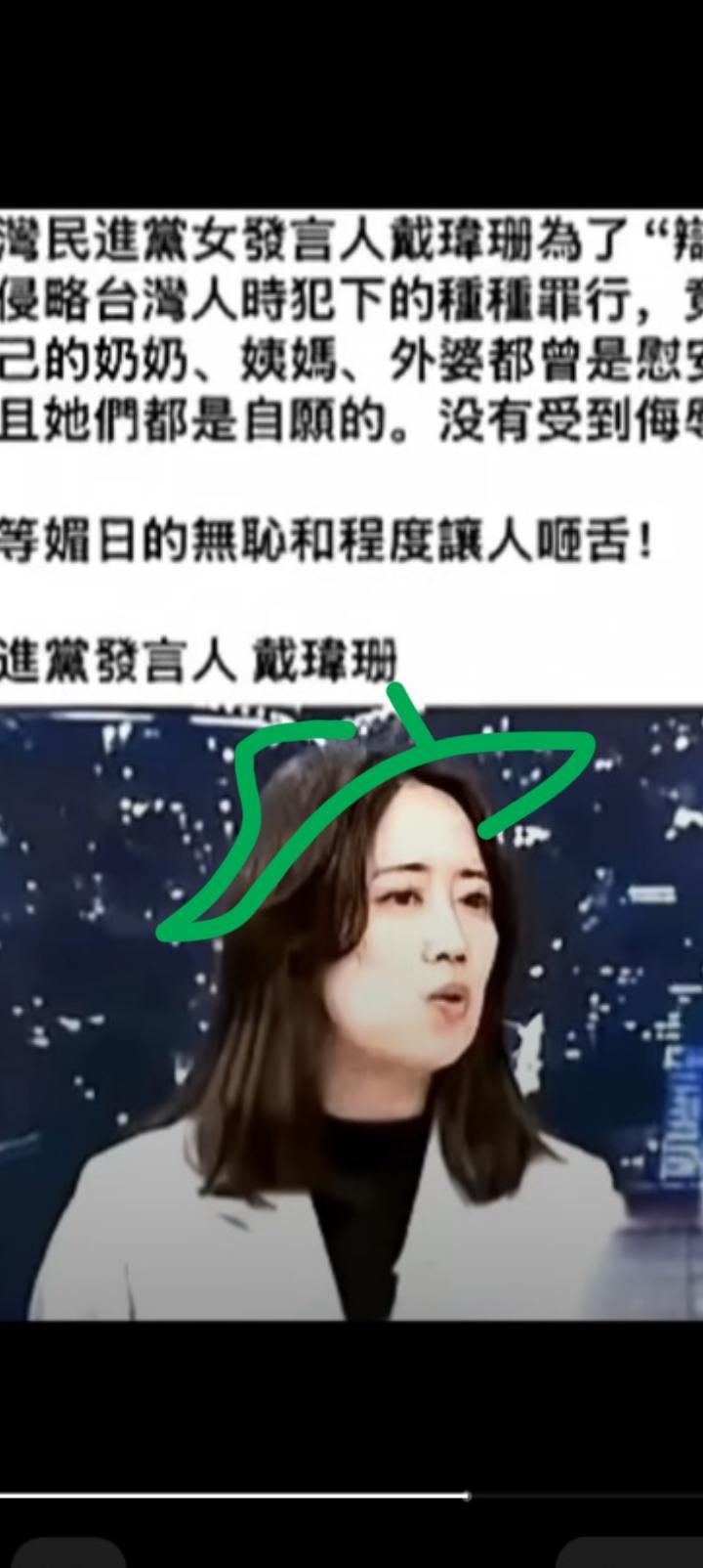 我奶奶外婆姨妈自愿当慰安妇,戴玮姗自豪地说。 这位台独分子, 也是民进党发言人,节目上与国民党立委罗志强针锋相对。 主持人听得晕头转向,迅速打断,别说了。