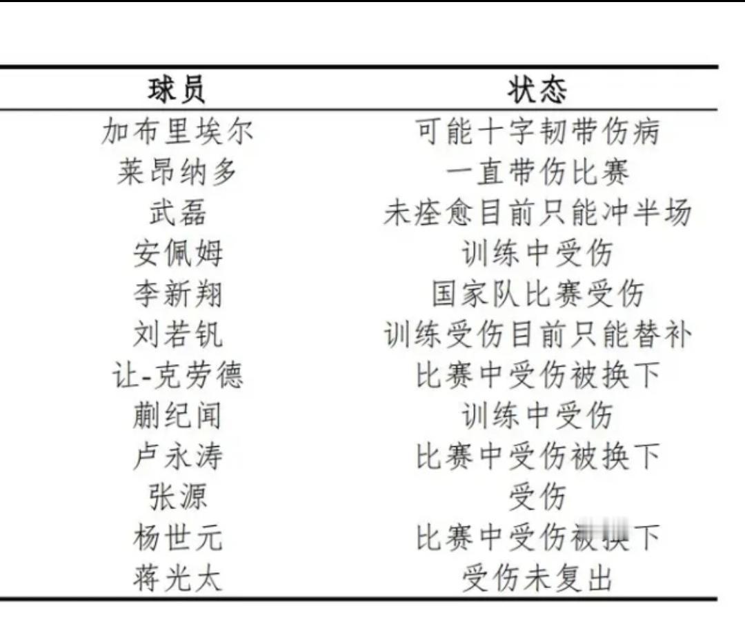 上海海港这一长串的伤员名单,看着都让人揪心。球迷:这个赛季保级就行。 比起在今晚上海德比中输球,更让球迷担心的是球队的伤员名单中又多了4人,尤其是加布里埃尔,在没有剧烈对抗的情况下受伤,就目前的信息来看,可能需要康复的时间会更长。 赛季才刚刚进行了五轮,球队的伤病名单已经有了一长串,其中还有着像武磊和蒋光太这些虽然伤愈,但还没有彻底恢复到最佳状态的球员。 球队的用人更加紧张,对于穆斯卡特而言,可谓是巧妇难为无米之炊,再好的战术也发挥不出来效果。也有不少球迷表示,海港对于争冠已经不抱希望了,赛季的主要任务,一方面是保级,另一方面是锻炼更多的小将。 那么问题来了,你觉得海港队这个赛季还有机会夺冠吗?