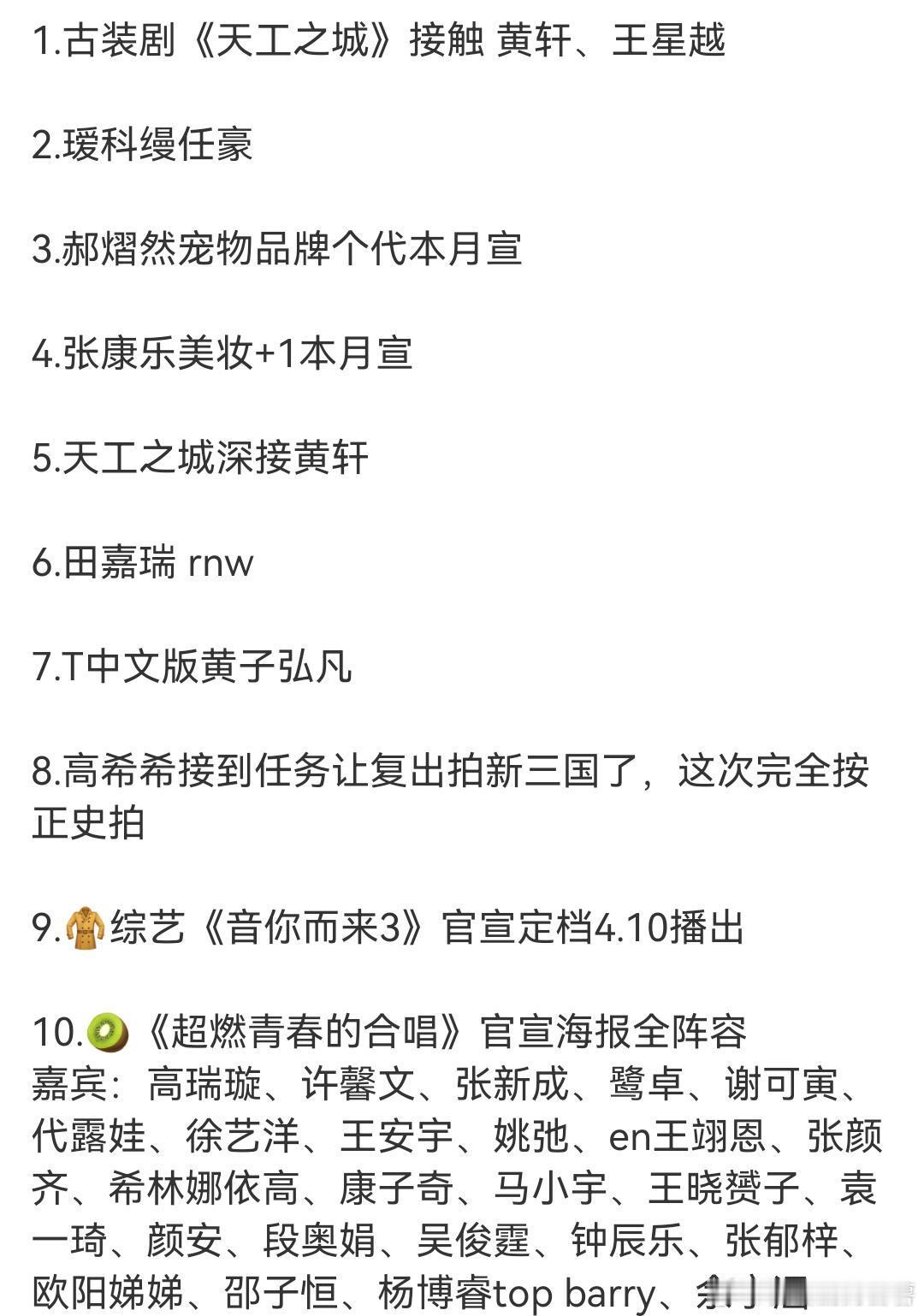 🍉1.古装剧《天工之城》接触 黄轩、王星越2.瑷科缦任豪3.郝熠然宠物品牌个代本月宣4.张康乐美妆+1本月宣5.天工之城深接黄轩6.田嘉瑞 rnw7.T中文版黄子弘凡8.高希希接到任务让复出拍新三国了,这次完全按正史拍9.综艺《音你而来3》官宣定档4.10播出10.🥝《超燃青春的合唱》官宣海报全阵容嘉宾:高瑞璇、许馨文、张新成、鹭卓、谢可寅、代露娃、徐艺洋、王安宇、姚弛、en王翊恩、张颜齐、希林娜依高、康子奇、马小宇、王晓赟子、袁一琦、颜安、段奥娟、吴俊霆、钟辰乐、张郁梓、欧阳娣娣、邵子恒、杨博睿top barry、余宇涵