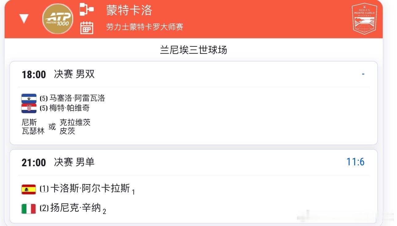 4.12日 蒙特卡洛决赛 阿尔卡拉斯vs辛纳