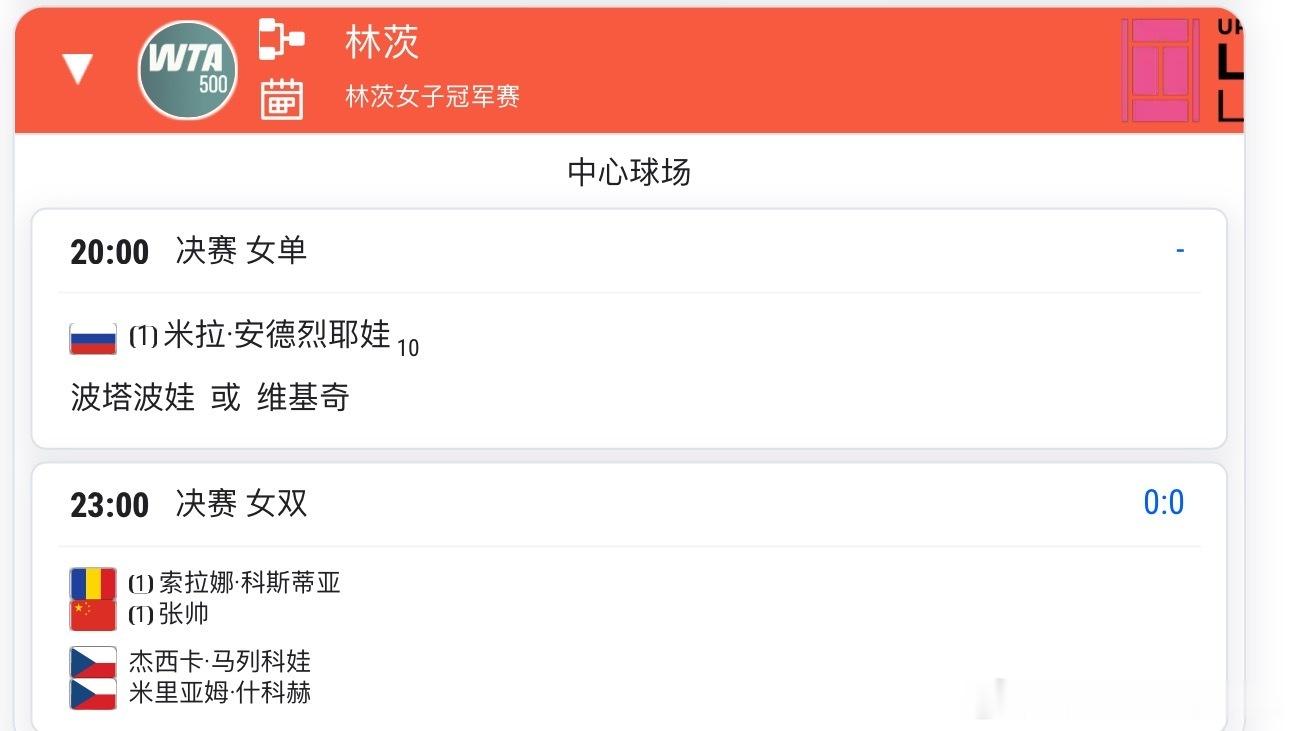20点WTA林茨决赛 安德烈娃vs波塔波娃随后张帅🇨🇳/科斯蒂亚双打比赛