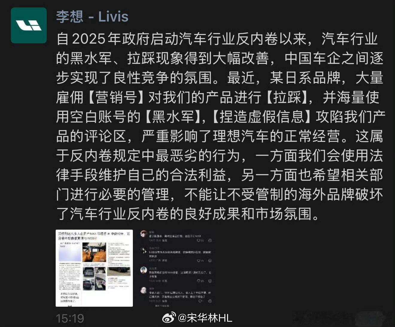 李想朋友圈再发文必须通过法律手段严厉处置!!不光是为品牌自己,也为所有理想车主。就我之前做过的几期理想车主聊车节目,一位理想 mega 车主说买车时确实被网络各种恶意的声音影响心情,好在自己及家人实在喜欢,最终仍然选择了 mega。还有一位理想 i8 车主,说怎么就给我贴上乱停车没素质标签了???非常委屈!!这种恶意抹黑层出不绝,是该大力整治整治了!!