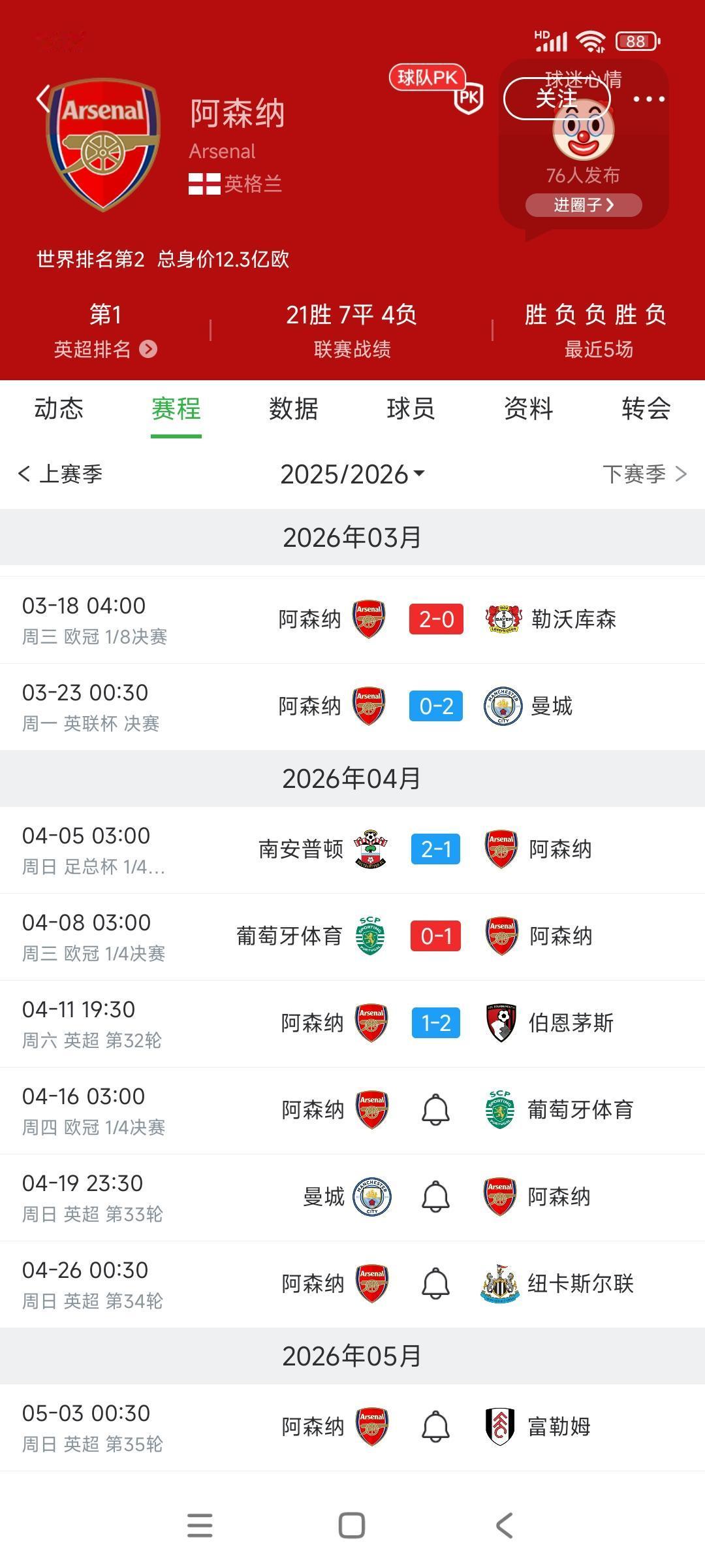 今天阿森纳输球,有丢冠的风险。 表面领先9分,还剩下6轮比赛。 但是曼城少赛2轮,下一轮主场踢阿森纳。 加上阿森纳有欧冠要踢,曼城全力拼英超了。 如果曼城反超很正常,最近阿森纳在英超踢得什么玩意,英超冠军不该是这种水平。 其实曼城也不强,曼城球迷都放弃争冠了,没想到阿森纳这么弱.....[捂脸]