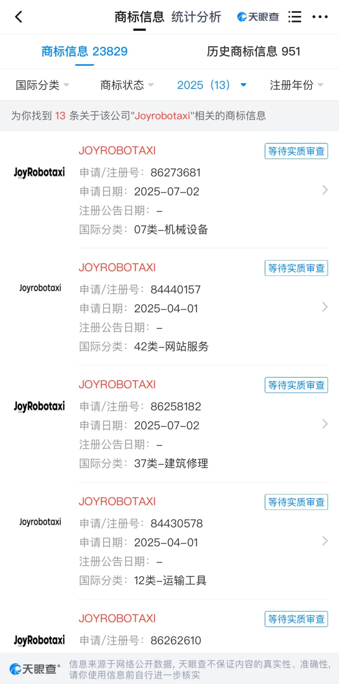事实上,在出行领域,京东还有更大的野心。早在去年5月,京东集团旗下公司北京京东叁佰陆拾度电子商务有限公司申请注册多枚“Joyrobotaxi”商标,商标国际分类覆盖运输工具、科学仪器、运输贮藏等领域。结合此次与长安联合推出“Open出发服务”来看,京东在自动驾驶出行领域还有很大的想象空间。