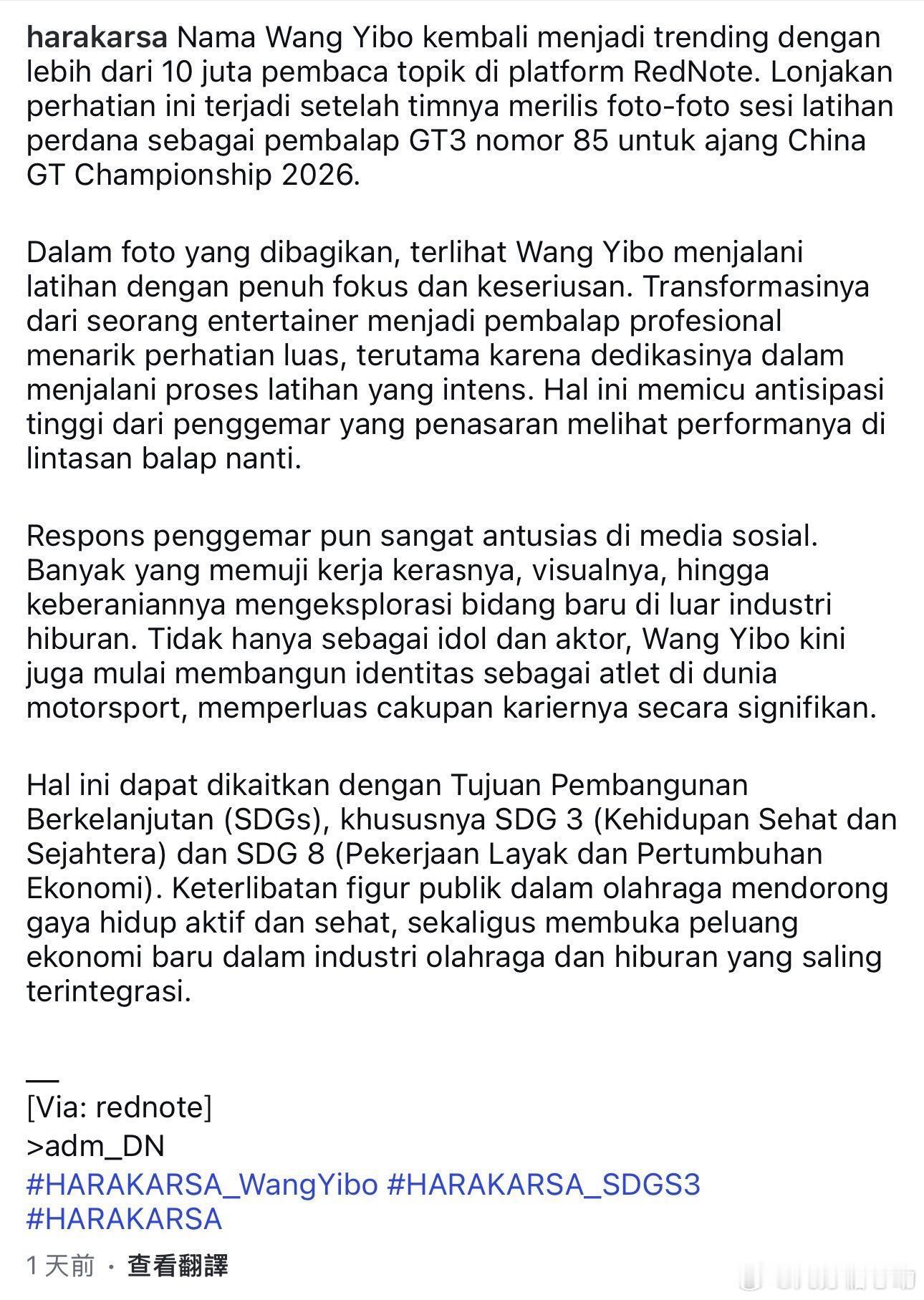 王一博的海外影响力🔥外媒发表了专门研究王一博的文章🔥:王一博与联合国可持续发展目标契合【王一博的名字再次成为热门话题,在xhs平台上的相关讨论量超过1000万。此次热度飙升源于他的团队发布了他作为2026中国GT锦标赛85号GT3车手的首次训练照片。在分享的照片中,王一博全神贯注、认真地进行训练。他从娱乐明星转型为职业赛车手的举动引起了广泛关注,尤其是他投入高强度训练的敬业精神。这更加激发了车迷们对他未来在赛道上的表现的期待。王一博在社交媒体上引发了粉丝的热烈反响。许多人称赞他的努力、俊朗的外形,以及勇于探索娱乐圈之外新领域的勇气。如今,王一博不仅是偶像和演员,也开始在赛车运动领域打造自己的运动员形象,显著拓展了他的事业版图。这与可持续发展目标(SDGs)密切相关,尤其是目标3(健康繁荣的生活)和目标8(体面工作和经济增长)。公众人物参与体育运动不仅鼓励积极健康的生活方式,也为体育和娱乐产业的融合开辟了新的经济机遇。】