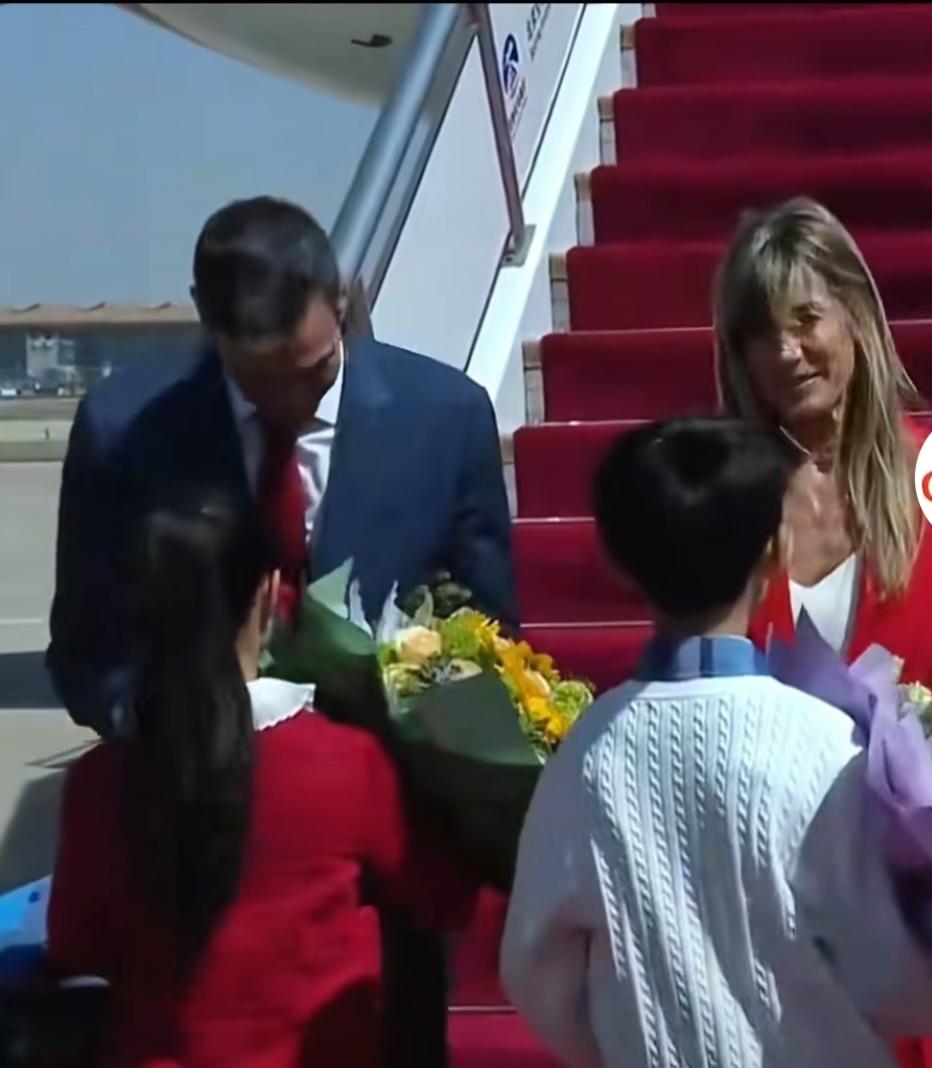 西班牙首相桑切斯特别重视和中国的关系,而他们这次特别的用心。从他们夫妻的穿着打扮就能看出来,他的夫人贝戈尼娅·戈麦斯特意穿了一套红色的衣服,而桑切斯戴了一条红色的领带,这是特意的打扮,因为他们都知道那三个字“中国红”。还有,那就是桑切斯四年四次访华,连续四年都来华。这频繁的来华次数,基本上没有多少个国家能做到,更别说每年来一次了。现场接机有一点特别有意思的地方,那就是给桑切斯和他夫人献花的花童的穿着,女孩穿的是红色的外套,恰好对应贝戈尼娅·戈麦斯红色的衣服。男孩外套的领子恰好是蓝色,对应的则是桑切斯的蓝色衣服。这一幕在当时显得是非常的和谐,简直就是恰到好处的神来之笔。