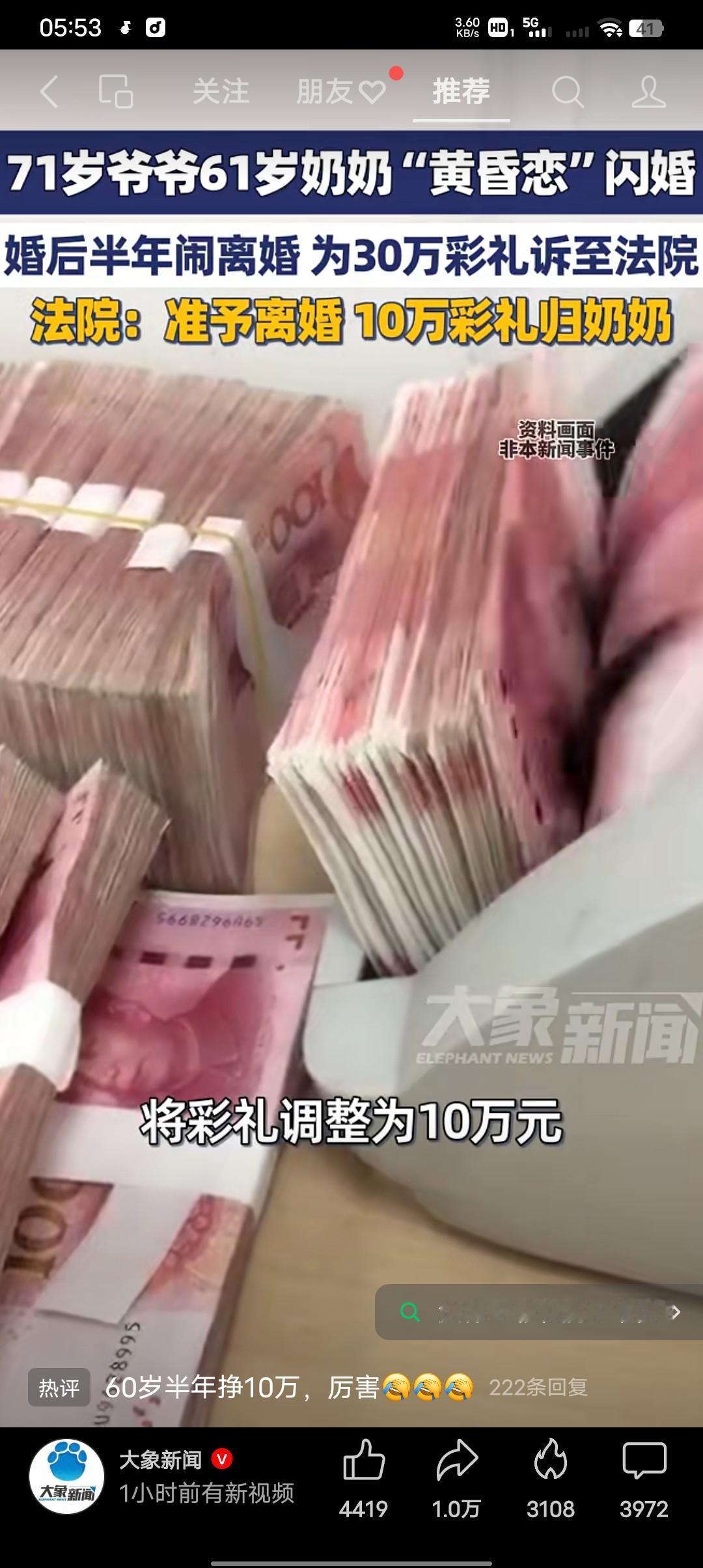 61岁老太闪婚闪离,30万彩礼判获10万。 近日福建厦门71岁老爷爷与61岁奶奶“黄昏恋”闪婚,婚前男方以婚前共同债券形式给付30万彩礼。 婚后仅半年两人就因生活不和经常吵架,诉至法院离婚,为了30万彩礼对簿公堂。 法院认为共同生活时间短,男方承担较多的生活开支,结合当地风俗与收入标准,将彩礼调整到10万元,最终判决准予离婚,10万元债权归奶奶所有。 有人说,你这样搞让年轻人怎么办?60岁奶奶的彩礼都要30万,年轻人彩礼该怎么给?有好多年轻人女士都说,好嫉妒奶奶的魅力,让我一个小女子情何以堪啊! 其实老年人的黄昏恋不容易,能遇到一个合适的更不容易,有人却把这第二次婚姻当做金钱交易,有人就是为了钱!有人却是为了仅存的余生能有个依靠,能有个安身之处!