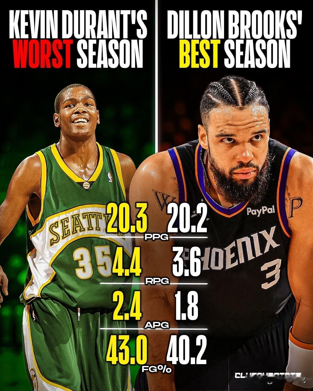 杜兰特喷狄龙的那句狠毒垃圾话确实是真话,杀人诛心,[笑哭] 此前在火箭对阵太阳时,杜兰特和狄龙之间的对位变得剑拔弩张时,杜兰特扔出了本赛季我们听过的最狠毒的一句。 “我的最差赛季都比你的最佳赛季好。” 但事实证明他没吹牛,😅 杜兰特的最差赛季是2007-2008赛季,场均得到20.3 分、4.4 篮板、2.4助攻,投篮命中率为43.0%。 而狄龙的最佳赛季 是2025-2026赛季,场均得到20.2分、3.6篮板、1.8助攻,投篮命中率为40.2%。 你以为杜兰特说的是狂言,但这确实是完美预言的垃圾话。