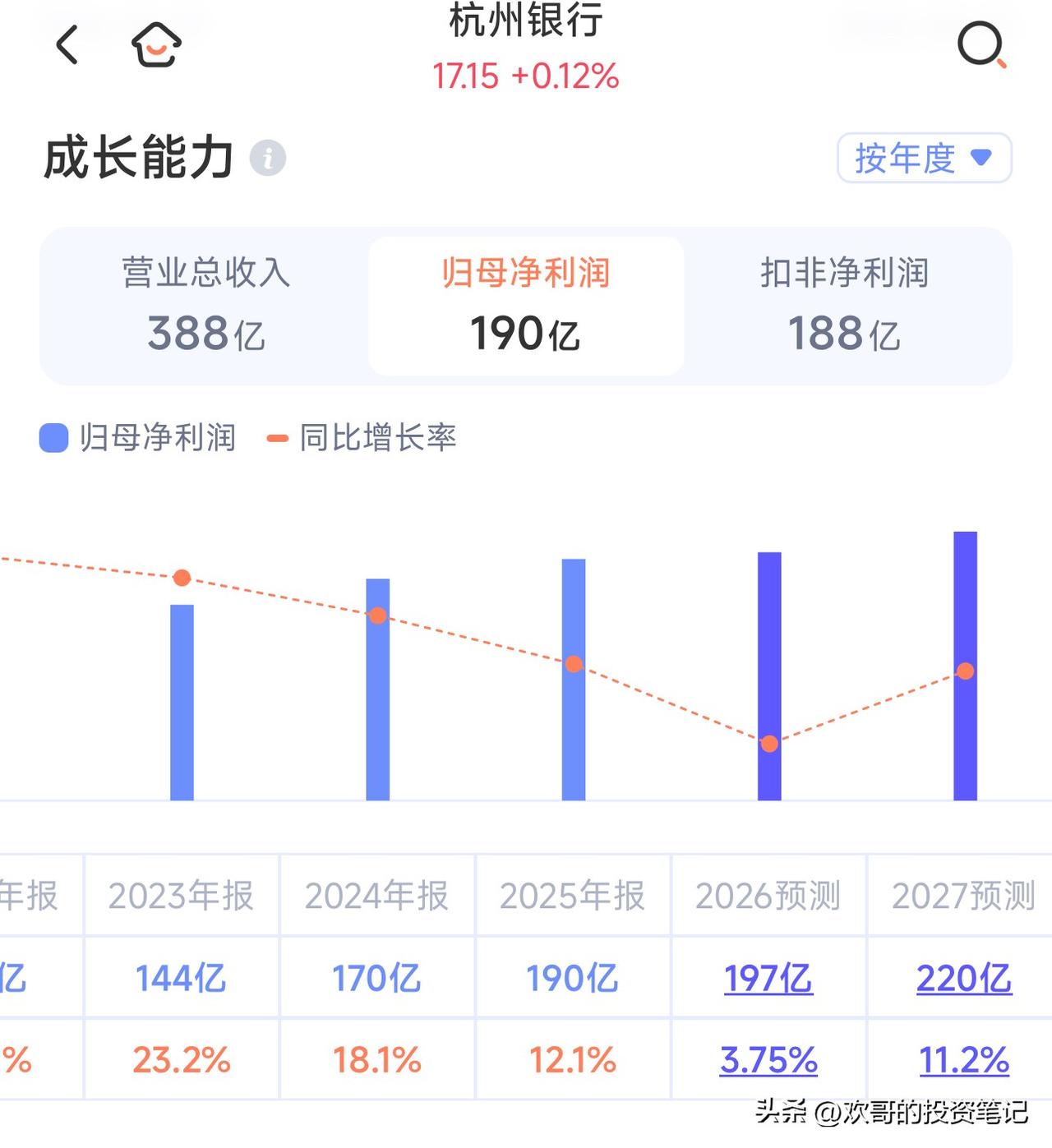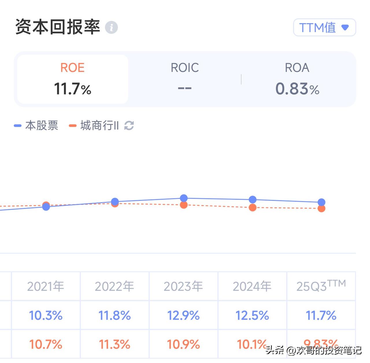 做股权投资,我始终认为,看一项资产,核心只抓一个指标就够了——ROE。它最直白地代表了一家企业为股东创造真实价值的能力。 放到商业银行这个赛道,拆解ROE的核心来源,我最看重的指标只有一个:RORWA。银行的业绩发布会、对外PPT,说得再天花乱坠都没用,RORWA不会说谎。 这个指标,藏着一家银行的经营底色。说白了,就是看它能不能用最少的资本,赚最多的利润。 银行的ROE,本质上约等于RORWA除以核心一级资本充足率。RORWA越高,银行就能用更低的杠杆拿到合意的ROE水平。而低杠杆,就意味着更高的安全边际。 这个道理其实很简单。我始终想不通,为什么还有那么多人,只盯着成长性给银行股定价。 也正是基于这个逻辑,我一直认为,当下的招行,完全可以加大分红力度,没必要再一点点挤牙膏。 这里有个看懂银行股增长逻辑的核心公式:ROE×(1-分红率)=内生增长率。息差平稳的前提下,这个公式对全行业基本都成立。 我们看下行业数据,去年四季度银行业平均净息差1.42%,今年一季度大概1.37%。虽仍在下行,但降幅较去年同期明显收窄。这种背景下,今年多数银行ROE继续下滑,本就是意料之中的事。 有些利润储备厚的银行,还能靠释放隐藏利润稳住ROE。但经过前两年的消耗,绝大多数银行的家底已经薄了,能做到的,只剩少数几家优秀的城商行。 全行业下行是大趋势,但分化早已出现。去年就有少数银行的净息差率先企稳,比如齐鲁银行、重庆银行、西安银行。 这里重点说杭州银行,这是优秀城商行里的典型。 去年业绩快报显示,它四季度净利息收入75亿,息差较前三季度明显回升,核心贡献来自存款利率的下行。最近和上市公司交流,我们拿到两个关键信息:今年一季度贷款增速与去年同期基本持平,净息差与去年四季度持平。 按这个数据测算,今年一季度它的净利息收入约78亿,较去年同期的65亿,同比增幅能到20%左右。就算其他营收按最保守的预期算,今年一季度它的营收、净利润增速,也能稳住15%左右。 再套回前面的核心公式,杭州银行分红率约25%,内生增速能到15%,这意味着,它会是今年行业里,少数能实现ROE逆势提升的银行。 买银行股,就要买这种业绩蒸蒸日上、ROE逆势向上的标的。那些ROE持续下滑、还看不到企稳拐点的股份行,我的观点很明确:没必要耗着等反转。这个过程,大概率会比你想的漫长得多。