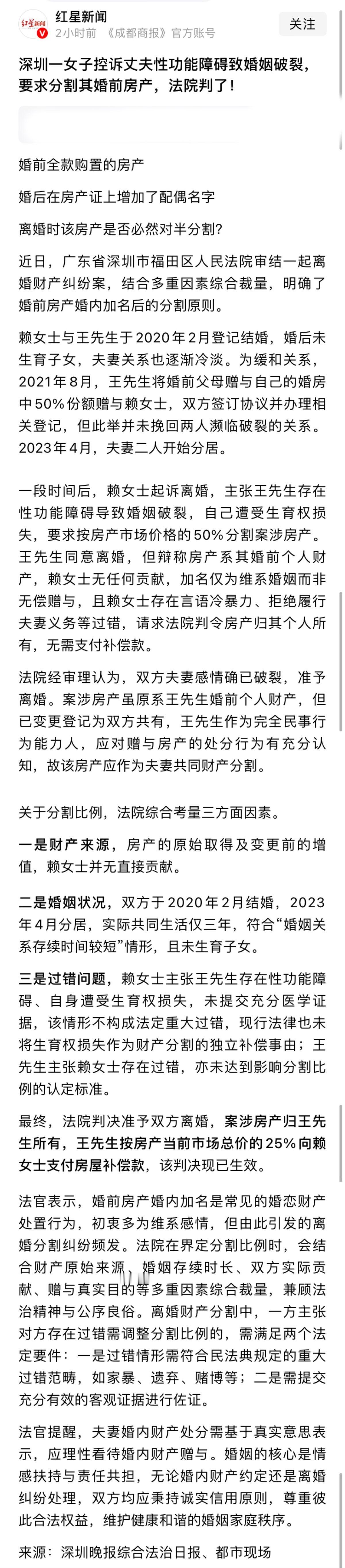 婚前房产加名字,法院不应该机械的理解为赠予。 深圳一名结婚3年女子,控诉丈夫“X功能障碍”,起诉到法院离婚要求分割丈夫婚前一半的财产,法院判决分给女子25%的财产。 婚前同意房产加名字,应该是以稳定的婚姻为前提,如果几年内离婚,应该是以补偿的相关法律为主。 特别是一线城市的房子,如果一套房500万以上,那就可以分割100多万,这对被分割一方显然有失公平。 对比一下深圳交通事故伤残赔偿标准,就知道这个金额有多大,120万左右的分割,相当于四级伤残,基本失去生活能力的标准。 这种分割式补偿,应该以这三年时间,双方共同的收入为衡量标准,特别是被分割一方,没有主观过错的情形下。