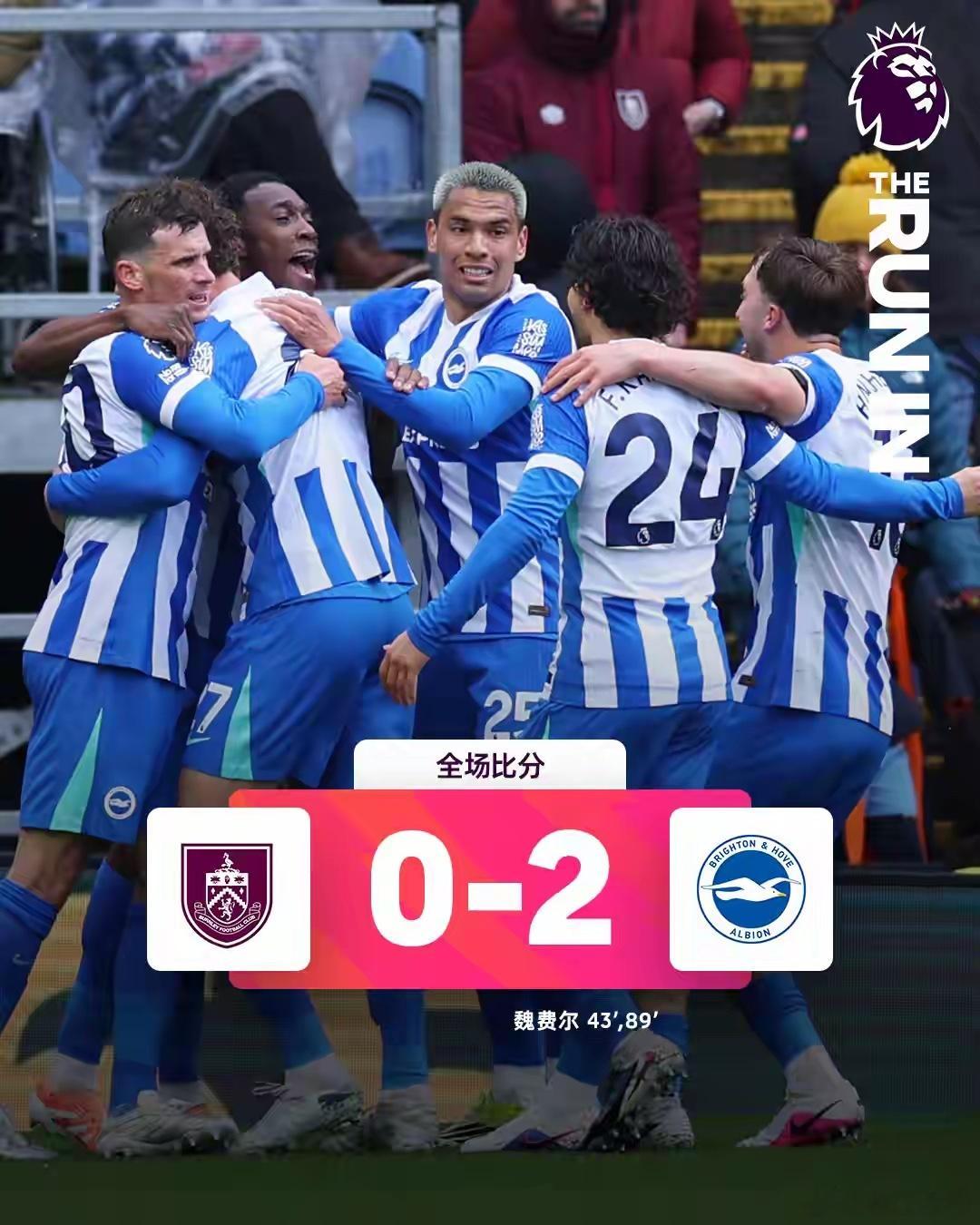 布莱顿客场2-0伯恩利,韦弗梅开二度,豪取三连胜,积分达46分稳居第九。伯恩利积20分深陷降级区。本轮过后,英超争冠、争四、保级悬念全面拉满。