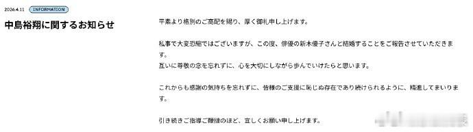 中岛裕翔新木优子结婚 11日,中岛裕翔宣布与新木优子结婚,两人去年12月曝光恋情,最早于2017年在电影《明天也有好吃的饭》合作,此后又合作电视剧《SUITS》(2018)及《SUITS2》(2020)等。