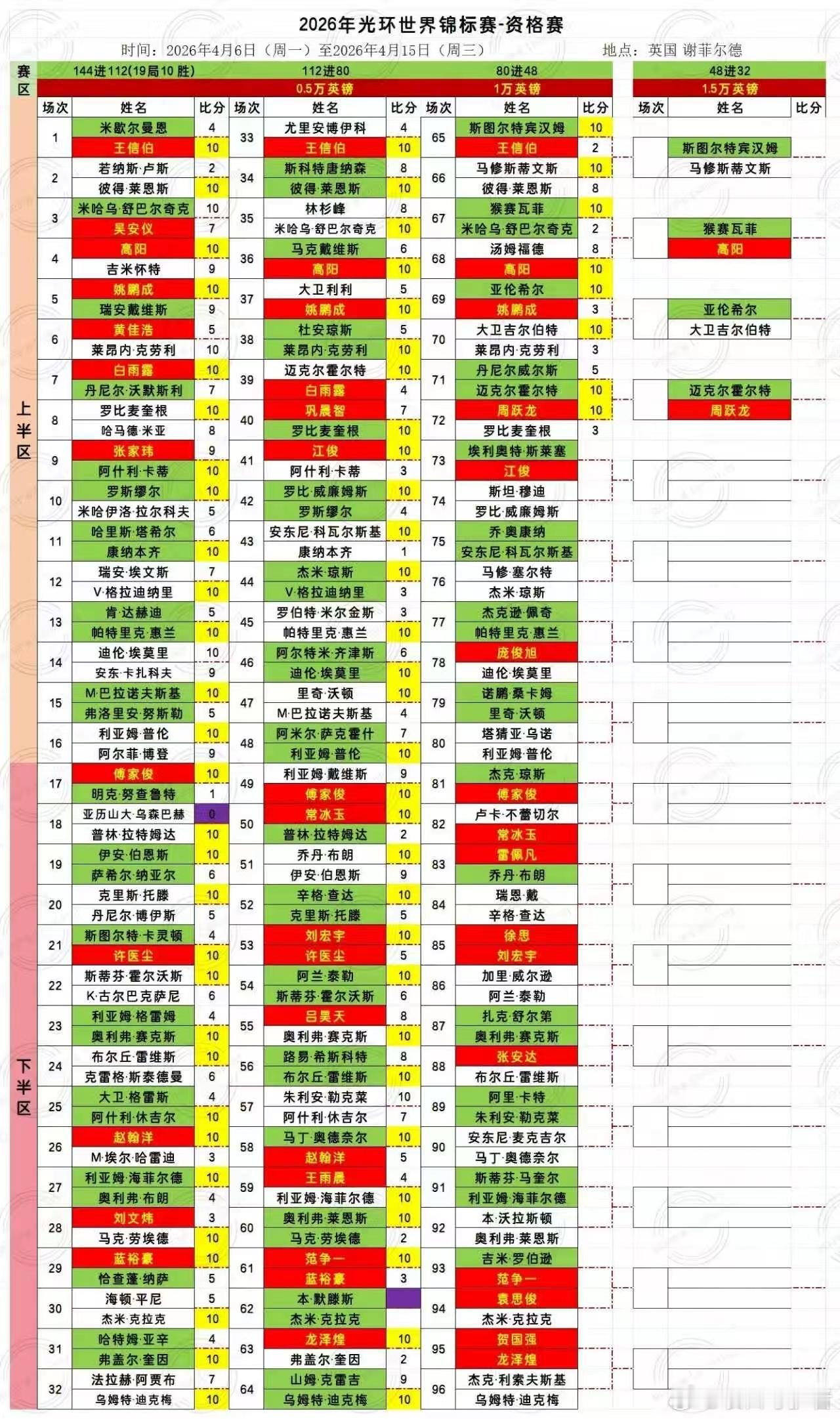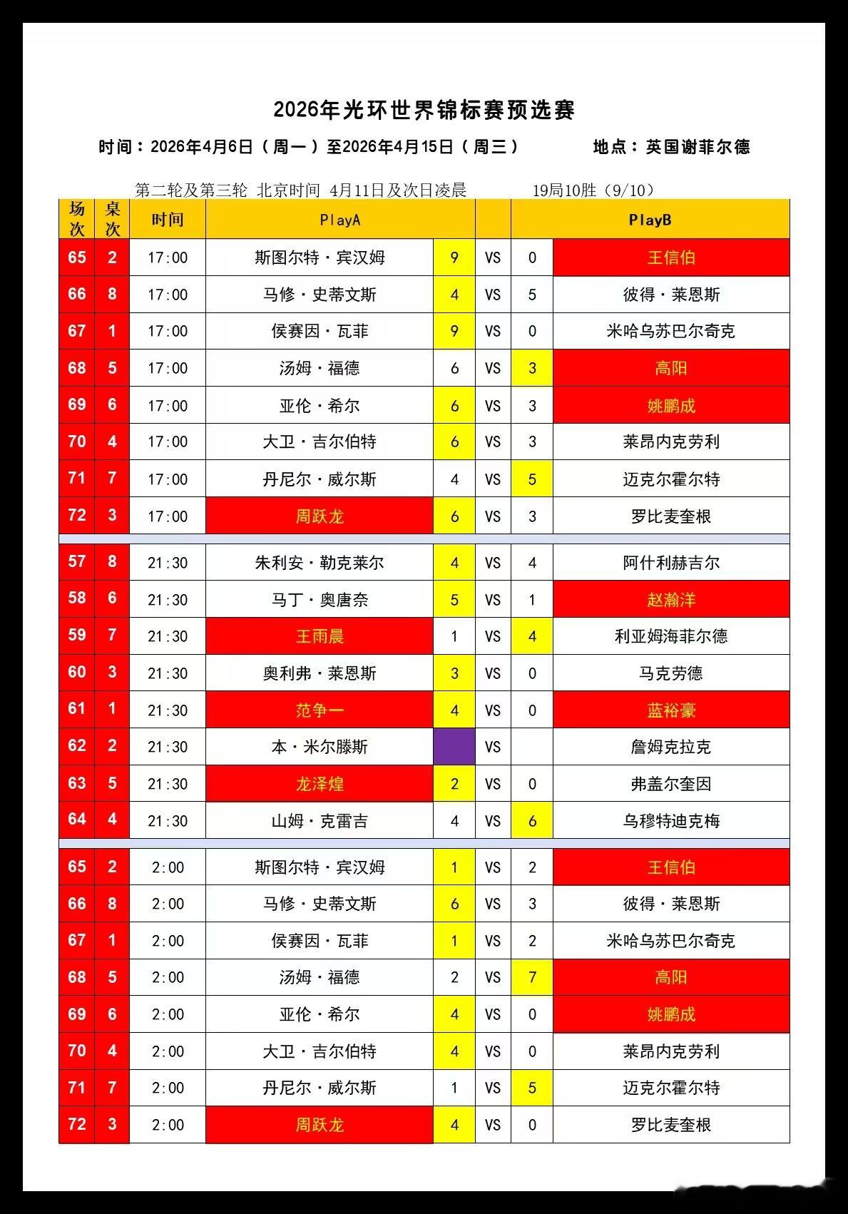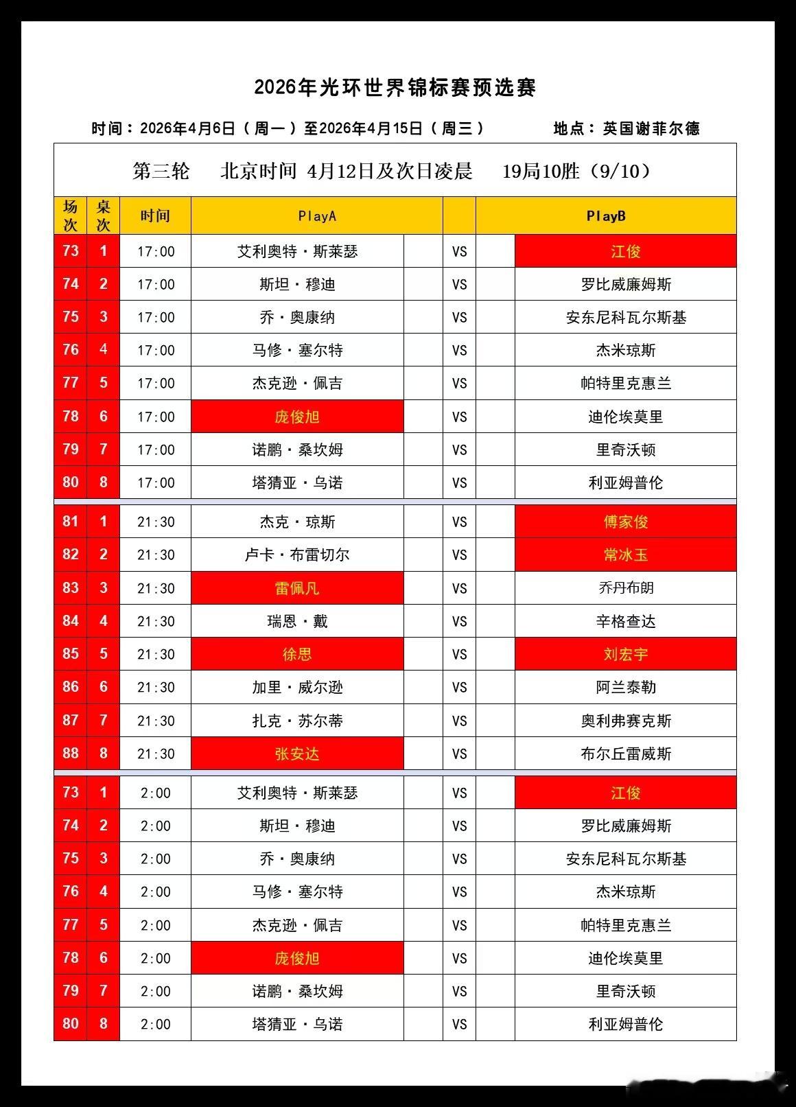 2026世界斯诺克世锦赛第五天 80进48中国选手王信伯、高阳、姚鹏成、江俊、傅家俊、常冰玉、刘宏宇、范争一、龙泽煌等九人晋级80;白雨露、巩晨智、许医尘、吕昊天、赵瀚洋、王雨辰、蓝裕豪等七人止步112;高阳、周跃龙两人率先晋级审判轮(48);2026.4.12日 星期日第三轮 80进48 19局10胜(9/10)17:00 直播: 江俊VS艾利奥特斯莱瑟 第一阶段 小窗:庞俊旭VS迪伦埃莫里 第一阶段21:30 直播:常冰玉VS卢卡布雷切尔 第一阶段 小窗:傅家俊VS杰克琼斯 第一阶段
