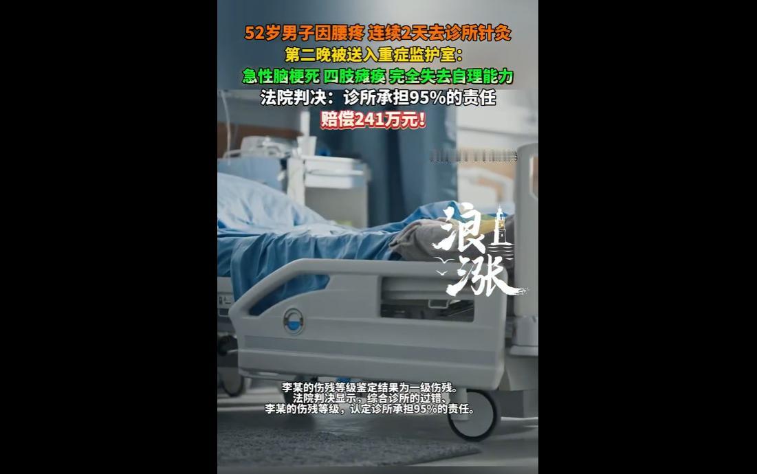 2023年9月,52岁的李某,因为腰疼难忍,找了家诊所做理疗针灸,本以为扎几针就能缓解不适,没想到这一扎,直接把自己扎进了深渊。 针灸后没多久,李某就出现腰腿活动受限,后续辗转多家医院治疗,被确诊为急性脑梗死、四肢瘫痪,经鉴定更是构成了一级伤残,一辈子都要和轮椅为伴。 这哪里是理疗,这分明是“致命针灸”! 腰疼是小毛病,结果被庸医一顿操作,直接治成了终身残疾,换谁能接受? 李某又气又痛,直接提起诉讼,向这家诊所索赔388万余元,毕竟一级伤残,后续的治疗、护理,哪一样不需要钱,这个索赔金额,其实一点都不过分。 更戏剧的是,一审法院还算公道,判决诊所赔偿李某各项损失350余万元,本以为这事就此尘埃落定,没想到近日阿克苏地区中院作出二审判决,直接改判,把赔偿金额降到了241万余元,一下少了100多万,网友看完直接炸锅,纷纷替李某抱不平。 有人吐槽:“庸医扎残人,赔偿还砍价,太离谱了”“一级伤残,241万够啥?后续护理都不够”,也有人理性分析:“二审改判大概率是考量了双方责任,但不管怎么说,诊所的过错跑不了”。 其实这事说白了,最无辜的就是李某,本来想治病,结果落得终身瘫痪,索赔之路还一波三折。 最让人膈应的是,现在很多小诊所、黑诊所,没有正规资质,医生也没有专业水平,就敢随便开展针灸、理疗等项目,仗着大家“针灸治百病”的认知,胡乱操作,殊不知,针灸是门技术活,扎错穴位、力度不当,都可能造成严重伤害,李某的悲剧,就是最好的教训。 最讽刺的是,诊所一句“失误”,就能轻飘飘地带过,可李某要面对的,是一辈子的瘫痪、无尽的痛苦,还有高昂的治疗费用。 二审改判或许有法律层面的考量,但对李某来说,再多的赔偿,也换不回他健康的身体,换不回正常的生活。 看病一定要去正规医院,千万别贪便宜、图方便,去那些没有资质的小诊所,不然可能小病治成大病,轻则遭罪,重则致残。 也希望相关部门能加强监管,严查庸医和黑诊所,别再让更多人重蹈李某的覆辙——治病是为了健康,不是为了雪上加霜!