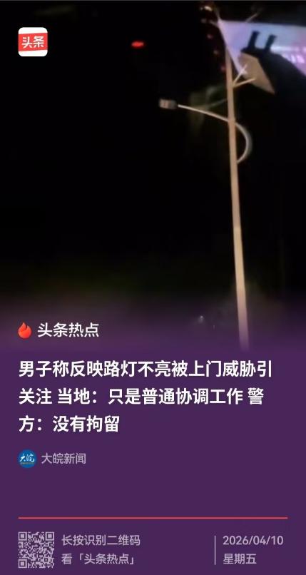 湖南郴州,男子春节回乡期间,见老家国道旁的路灯不亮,便随手在网上发了个视频,吐槽了一下,怎料,事后被村镇领导和派出所民警的找上门。男子声称被要求删除视频,还说要把其先关15天。对此,当地回应只是普通协调工作,不存在威胁。派出所回应,警方办案要依法依规,没有拘留! 老家在湖南郴州桂东县大塘镇的黄先生常年在外打拼,只有逢年过节才会回一趟老家大塘镇春风村。 去年下半年离乡的时候,他就发现老家附近106国道上的路灯,有好几盏不亮了,到今年春节开车返乡,他发现路灯的问题不仅没解决,反而更严重了。 他沿着106国道大塘镇到桂东县城的路段走了一圈,损坏不亮的路灯竟然有50多盏,沙田镇那处1公里长的隧道,里面的路灯也像是被遗忘了一样,漆黑一片,白天进去都得摸索着走。 这漆黑的路面,给当地人的出行带来了太大的麻烦。 黄先生看着心里不是滋味,他既担心乡亲们的安全,也觉得这样漆黑的路段,对来家乡旅游的游客也不友好,于是用手机拍了几段路灯不亮的视频,发到了网上。 他只是单纯希望能通过网络的力量,引起当地部门的注意,赶紧把路灯修好,让大家晚上出行能安心一点。 让他没想到的是,视频发出去没几天,最高的时候获得了22万点赞,很多网友都留言支持他,说他做的是实事,还催着当地部门赶紧解决问题。 可他怎么也没想到,这份热心,竟然给自己惹来了麻烦。 视频发布后的第三天,大塘镇一名郭姓党委委员,带着几名镇干部、村干部,还有派出所的民警,直接找到了黄先生家。 那天黄先生刚好外出办事,家里只有他年迈的父母在家,两位老人一辈子在农村生活,从来没见过这么大的阵仗。 这群人一进门,就让两位老人赶紧联系黄先生,把网上的视频删掉。 更让两位老人害怕的是,其中有人还说了一句,要是联系不上黄先生,就先把他拘留15天。 老两口一听这话,当场就慌了神,以为儿子犯了什么大错,吓得又哭又闹,连站都站不稳,直到这群人走了,还在不停念叨着儿子的名字,担心他真的被拘留。 黄先生办事回来,得知这件事后,又心疼又生气。 他说自己只是反映了一个民生问题,既没有造谣,也没有闹事,不知道为什么会被这样对待。 更让他气愤的是,这些人有什么事可以直接联系他,没必要去为难年迈的父母,让老人受惊吓。 这件事很快被曝光,引发了全网关注,当地相关部门也赶紧作出了回应。 大塘镇政府的工作人员承认,黄先生反映的路灯问题确实存在,那些路灯因为安装时间太长,常年风吹日晒,线路老化严重,才导致无法正常点亮。 他们还表示,接到黄先生的反映后,已经第一时间安排工作人员进行维修更换,现在涉事路段的路灯已经全部恢复正常,夜间通行也安全了不少。 至于黄先生所说的威胁和拘留,镇政府方面明确否认,说工作人员上门只是做普通的协调沟通,不存在任何威胁行为,也从来没有说过要拘留他的话。 当时一同上门的村干部也补充说,他们上门就是和黄先生的家属协商删帖的事,民警虽然到场了,但为了不引起不必要的误会,警车停在了很远的地方,没有发生任何冲突。 他还提到,黄先生平时就喜欢在网上反映各种问题,这次可能是因为情绪太激动,对工作人员的话产生了误解。 辖区派出所的工作人员也作出了回应,说警方办案一直都是依法依规,不可能随意作出拘留决定,压根就没有“拘留黄先生15天”这回事。 记者后来也试图联系那位带队上门的郭姓党委委员,想了解更多上门的细节,但对方当时正在县里开会,多次打电话都无人接听,也没能给出更多解释。 黄先生的行为是完全合法的,我国宪法明确规定,公民有权对国家机关和工作人员提出批评、建议和检举,相关部门必须认真查清事实、负责处理,任何人都不能压制和打击报复。 而且道路交通安全法也有明确要求,道路养护部门必须保证照明设施正常运行,涉事路段50多盏路灯长期不亮,本身就是相关部门履职不到位。 现在路灯已经修好了,但这件事引发的争议并没有平息。 网友们的疑问越来越多,一个修路灯的小事,至于让镇党委委员带队,还让民警一同上门吗? 如果只是正常协调,为什么会把两位年迈的老人吓得又哭又闹?为什么不先想着解决路灯问题,反倒第一时间急着让删视频? 黄先生坚持说自己被威胁,官方却一口咬定只是正常协调,双方各执一词,谁也说服不了谁。 大家想要的不过是一个真相,希望当地能进一步公开事件的详细经过,把事情说清楚、讲明白,既给黄先生一个合理的说法,也给关注这件事的网友一个交代。