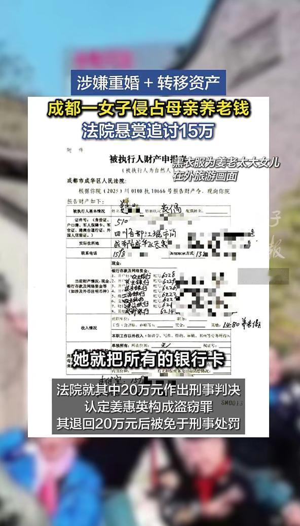四川,84岁老太被54岁未婚的小女儿送进养老院,不料,老太与前夫生的大女儿,私自带母亲出养老院,伪造假身份证,前后盗取母亲35万占为己有,后小女儿作为监护人代母亲告上法院,大女儿还回20万,剩下15万拒绝归还,甚至大额取现转移财产,当小女儿申请强制执行时,法院无法查到大女儿的钱去哪了?当法院追究其配偶为被执行人时,发现大女儿曾有6段婚姻,5段离异,还没和第三任丈夫离婚,就和第四、五任登记结婚,想要钱又遇阻,最终,法院只好发布悬赏公告。 成都84岁的姜大妈,一辈子没享过太多福,两段婚姻留下了四个女儿,年纪大了以后,不光有老年痴呆,还有器质性精神疾病,有时候连自己的亲闺女都认不全。 负责照顾她的是小女儿黄某,今年53岁,自己还有两个身体不好的亲姐姐,三个人轮流照顾母亲。 2024年上半年,姜大妈又犯了精神病,住了一段时间医院,出院后状态还是很差。 三姐妹商量来商量去,最终决定把母亲送到成都成华区的一家养老院,这样既能让母亲得到专业照顾,她们也能稍微松口气。 但没想到,她们把母亲送到养老院之后,母亲会被别有用心的人利用。 这个别有用心的人,就是姜大妈和第一任丈夫生的大女儿姜某。 她今年已经六十多了,跟姜大妈断联了四五十年,平时没正经工作,还有前科,不知道从哪听说母亲进了养老院,就突然找上门来。 姜某一开始只是以探望母亲的名义,频繁往养老院跑,慢慢摸清了养老院的管理漏洞,知道工作人员不会严格核实身份,就动了歪心思。 有一次,她趁着养老院工作人员换班、看管松懈的时候,谎称要带母亲出去做身体检查,工作人员没多想,就稀里糊涂地让她把姜大妈带走了。 姜某没带母亲去医院,而是直接拉着老人去了银行。 她知道母亲名下有40万存款,是老伴去世后卖房的钱,再加上平时的养老金,分成两张20万的存单存在银行,一张已经到期,一张还没到期。 第一次取款是8月份,姜某带着姜大妈取走了那张到期的20万,给老人留了5万现金,剩下的15万全揣进了自己兜里。 见没人发现,姜某胆子越来越大,9月份的时候,她特意做了一张假身份证,趁着去养老院看母亲的机会,忽悠着老人把真身份证换了过来,然后拿着真身份证去银行,把另一张没到期的20万也取了出来。 后来黄某调取银行监控才知道,那天天气特别热,姜某却裹得严严实实,帽子、口罩戴得一应俱全,取完钱连数都没数,就急匆匆地走了,一看就是早有准备。 9月中旬的中秋节,黄某从重庆赶回成都,去养老院陪母亲过节,还想着陪母亲去银行处理一下养老金的事,结果到了银行,工作人员一看身份证就说有问题,这张身份证是假的。 黄某赶紧回养老院找院长问情况,可院长一口咬定,没人带老人出去过,也没人换过老人的身份证。 直到黄某强烈要求调取养老院监控,院长才慌了神,监控里清清楚楚显示,姜某不仅多次来养老院,还换走了母亲的真身份证,带母亲出去过好几次。 黄某赶紧把母亲接出养老院,又带着老人去银行查存款,这一查才发现,两张存单里的40万已经被取光了,她立刻就报了警。 警方在调查中还发现,姜某曾经有过6段婚姻,5段离异,而且和第四、五、六任丈夫以婚姻的名义生活的时候,可能还没有和第三任丈夫正式办理离婚。 警方很快就找到了姜某,姜某因涉嫌盗窃罪被刑拘,后来退还了15万,还交了5万多涉案款项。 黄某也赶紧委托机构给母亲做了鉴定,确认姜大妈是无民事行为能力人,法院也正式指定她为母亲的监护人。 到了2025年3月,法院开庭审理这起案子,姜某却辩解说是母亲自愿把钱给她的,还说母亲想把财产分给四个女儿,更让人意外的是,养老院院长竟然也出来作证,说姜大妈确实有这个意思。 最终,法院只认定了姜某盗取20万的事实,因为她有自首,退赃的情节,又是盗窃近亲属的财物,就免予了刑事处罚,只把扣押的5万多还给了姜大妈。 黄某肯定不服这个判决,她觉得姜某明明偷了40万,而且养老院没有履行约定,明显违约。 于是又委托律师起诉了姜某和养老院,后来养老院跟她们达成了和解,黄某就撤销了对养老院的起诉,转而向检察院申诉,要求重新判决。 更让人寒心的是,黄某后来发现,姜某嘴上说自己生活困难,连吃饭都成问题,可实际上浑身上下都是名牌,社交账号里全是炫富的视频。 这起案子,就是养老院管理不到位,给了别有用心的亲属可乘之机,最终受伤的还是年迈无依的老人。 现在,黄某一家人唯一的心愿,就是能追回母亲所有的养老钱,让母亲能安安稳稳地度过晚年,至于检察院会不会抗诉、最终能不能讨回公道,还得慢慢等消息。