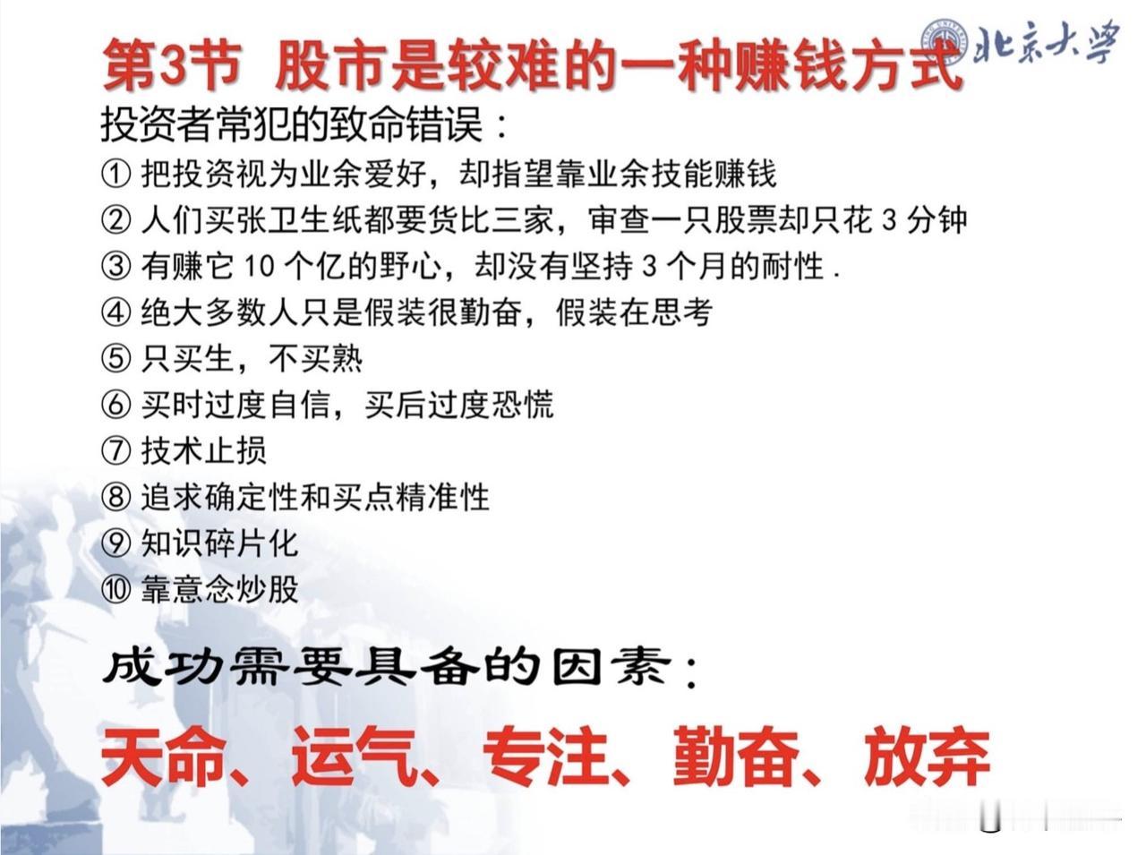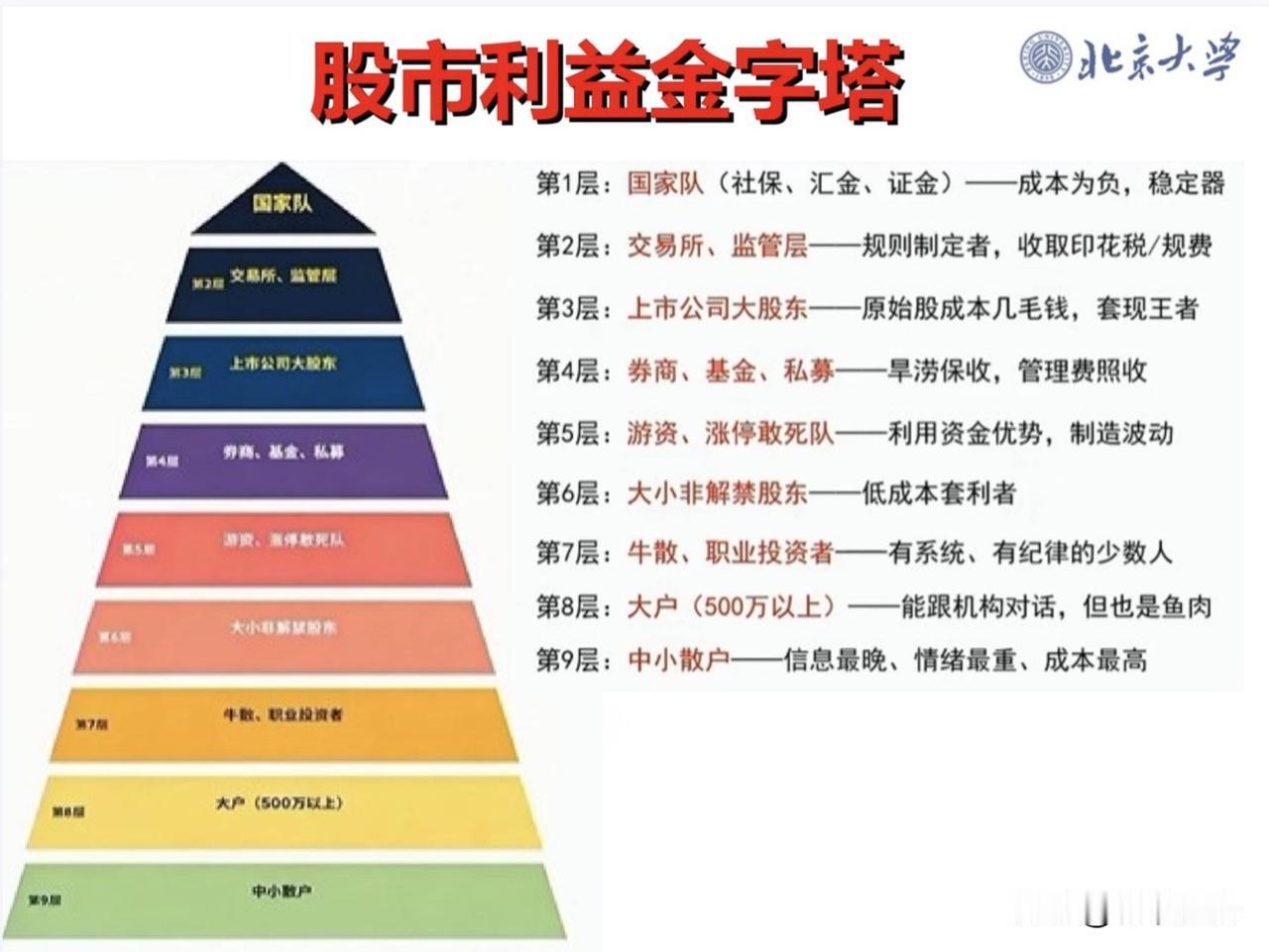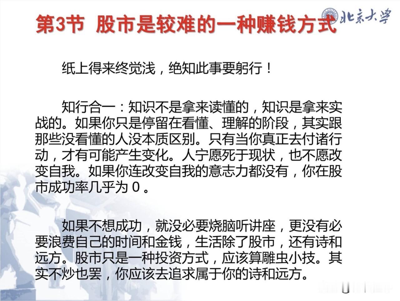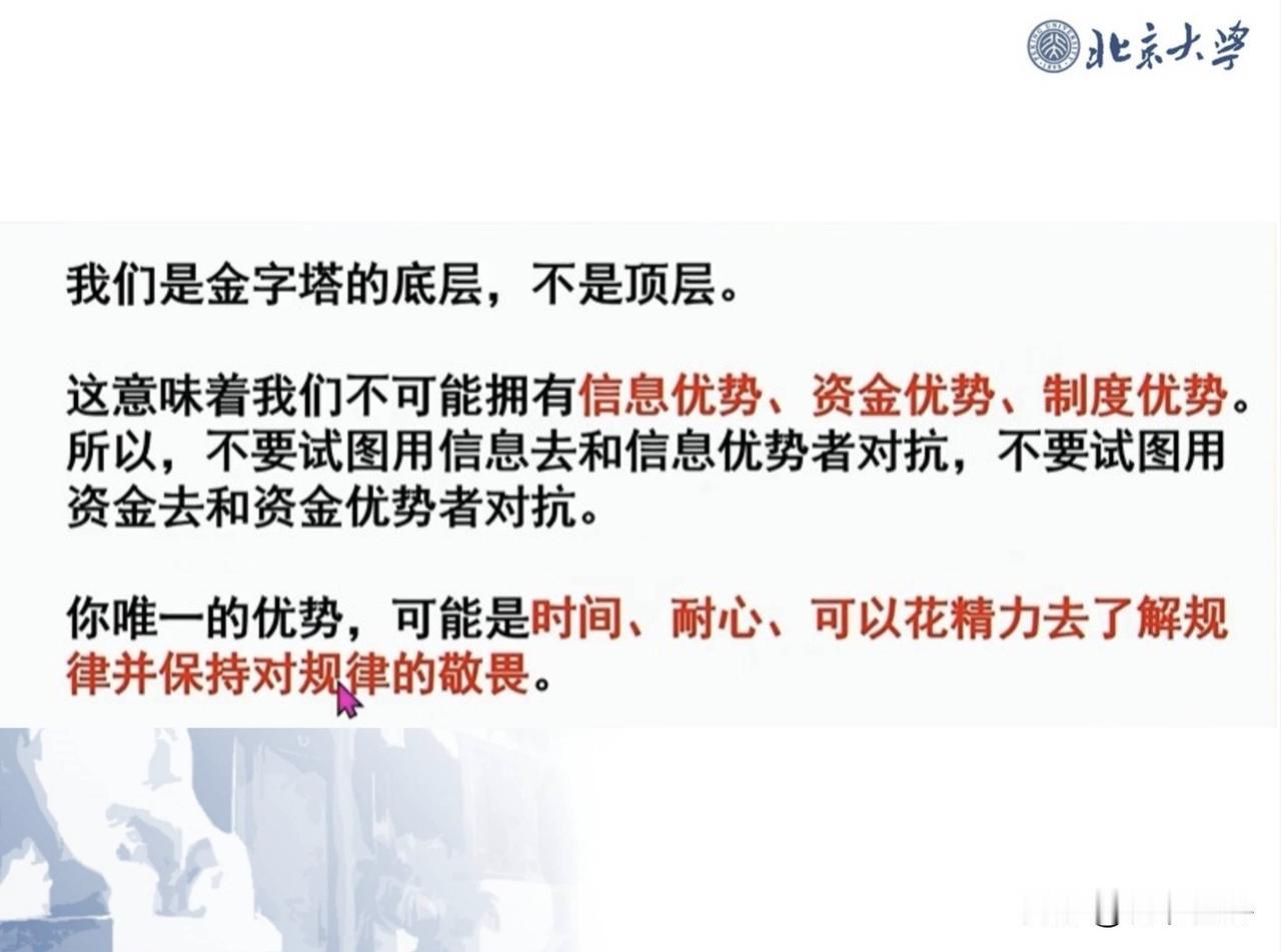 看北大教授炒股65PPT,感到所见略同,也是自己反复说的东西,处在最末层的散户还是要看到自己的优势劣势,有自知之明,赚自己认知范围内的钱,那就用“闲时闲钱赞股收息”,还不耽误上班本职工作,也不用天天盯盘,别梦想发大财,这样人就不贪心,不贪婪就不会上当受骗,不会被割韭菜,能提高生活质量,给家庭财富保值增值就很好了,虽然5000余股票你就选各行各业的前三名龙头就可以了,就算亏也不会血本无归。