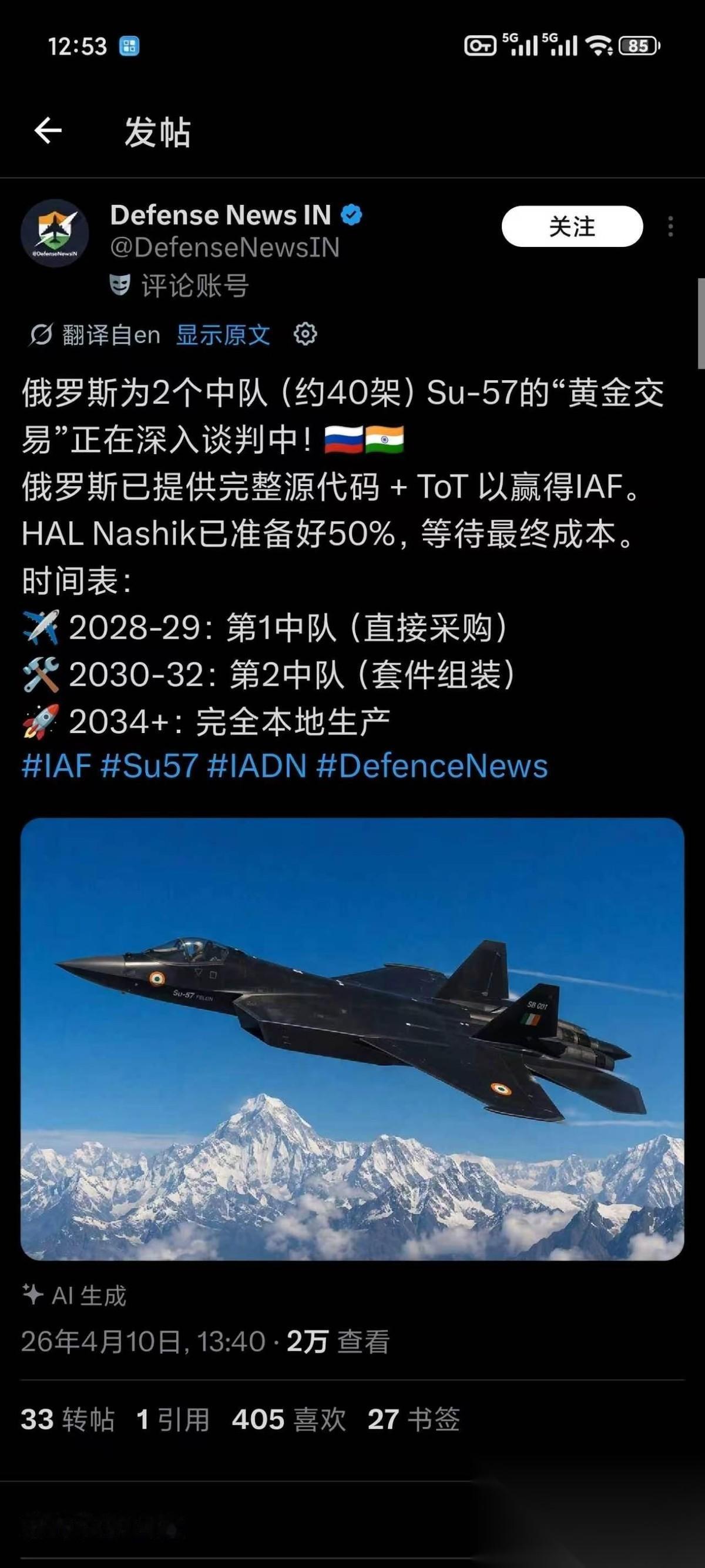 若干年后的未来,三哥的空军有望列装俄制苏-57隐形战斗机。只是这AI生成的图片里的涂装是真丑……俄罗斯为2个中队的五代机采购案,正跟新德里在谈判桌上疯狂拉扯。 听说莫斯科这回真急了,连底层软件代码都舍得往外掏。 全套先进技术转让,大饼画得相当诱人。 按他们给的进度表:头两三年,新德里先掏钱买原装整机;接着运零部件过去,在当地搞散件拼装;等熬过2034年,直接在自家车间里实现百分百本土制造。 关注这事儿的老军迷可能还记得2018年那出闹剧。 当年,新德里嫌弃苏-57雷达反射面积大,发动机也不过关,硬生生砸了双方合搞的隐身战机项目。 当初摔门走人,现在怎么又坐回一桌了? 账其实算得很明白。表面上谈的是飞机,底子里全是各自的生存焦虑。 先说俄罗斯这头。被西方制裁卡着脖子,自家军工产业眼下太缺外汇来回血续命了。 把压箱底的绝活儿摆上货架,看着是肉疼。可要是新战机生产线断了顿,那才真要命。 那头儿的印度,看似捡了个附赠核心技术的便宜,骨子里却全是无奈和眼红。 看看周边邻居,人家的先进战机早就开始批量服役了。自己家憋了多年的本土型号呢?还在PPT上打转。 这种巨大的防空代差压在头顶,逼得他们只能硬着头皮去吃回头草。 但这步棋,印度大概率得走砸。 花钱扫货不难,可实体工业从不相信捷径。把国产化落地的指望全押在本土军工企业身上,胆子未免太大了些。 他家航空公司的维修组装手艺,在国际上早就以“修一架摔一架”出了名。 指望靠着几行源码、一堆图纸,就能在短短十年里吃透最前沿的航空制造体系?这完全是在跟客观的工业规律叫板。 买得来最顶级的全套图纸,终究买不来大国重器背后的扎实工业底气。对此,你怎么看?
