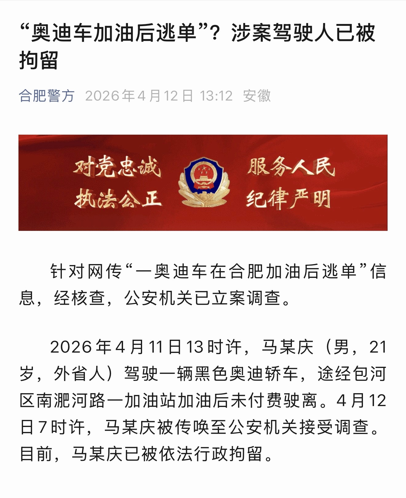 逃单奥迪车驾驶人已被拘留速度真快处理结果来了,拘了!先把人家加油员的钱还了!