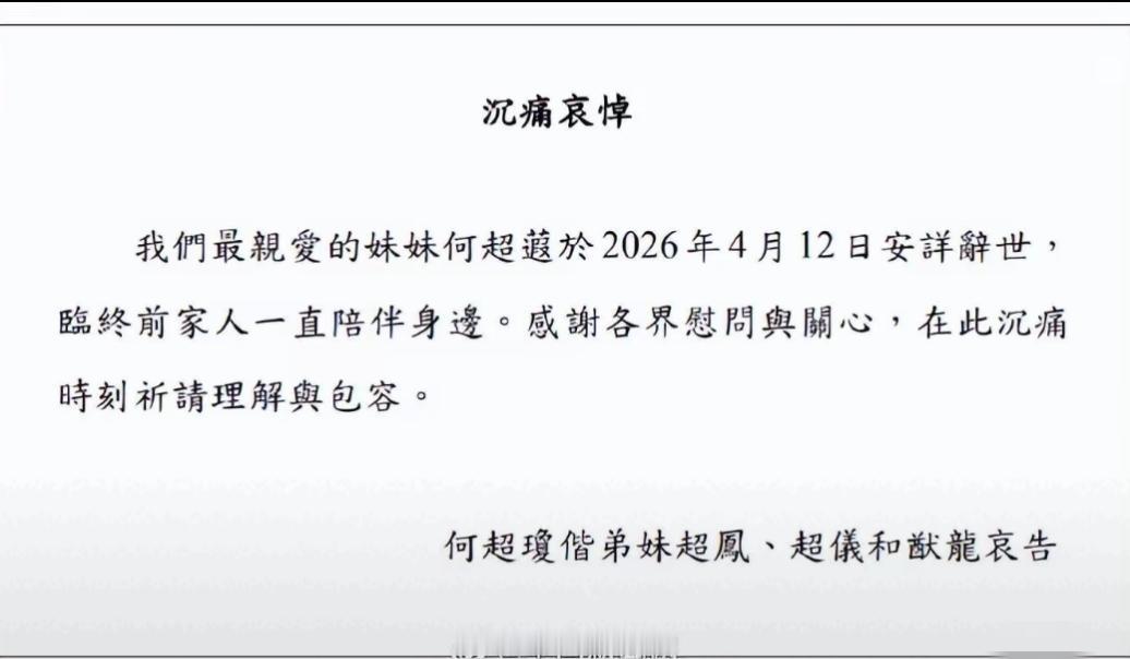赌王何鸿燊女儿何超莲于2026年4月12日安祥逝世,家人发出沉痛哀悼!