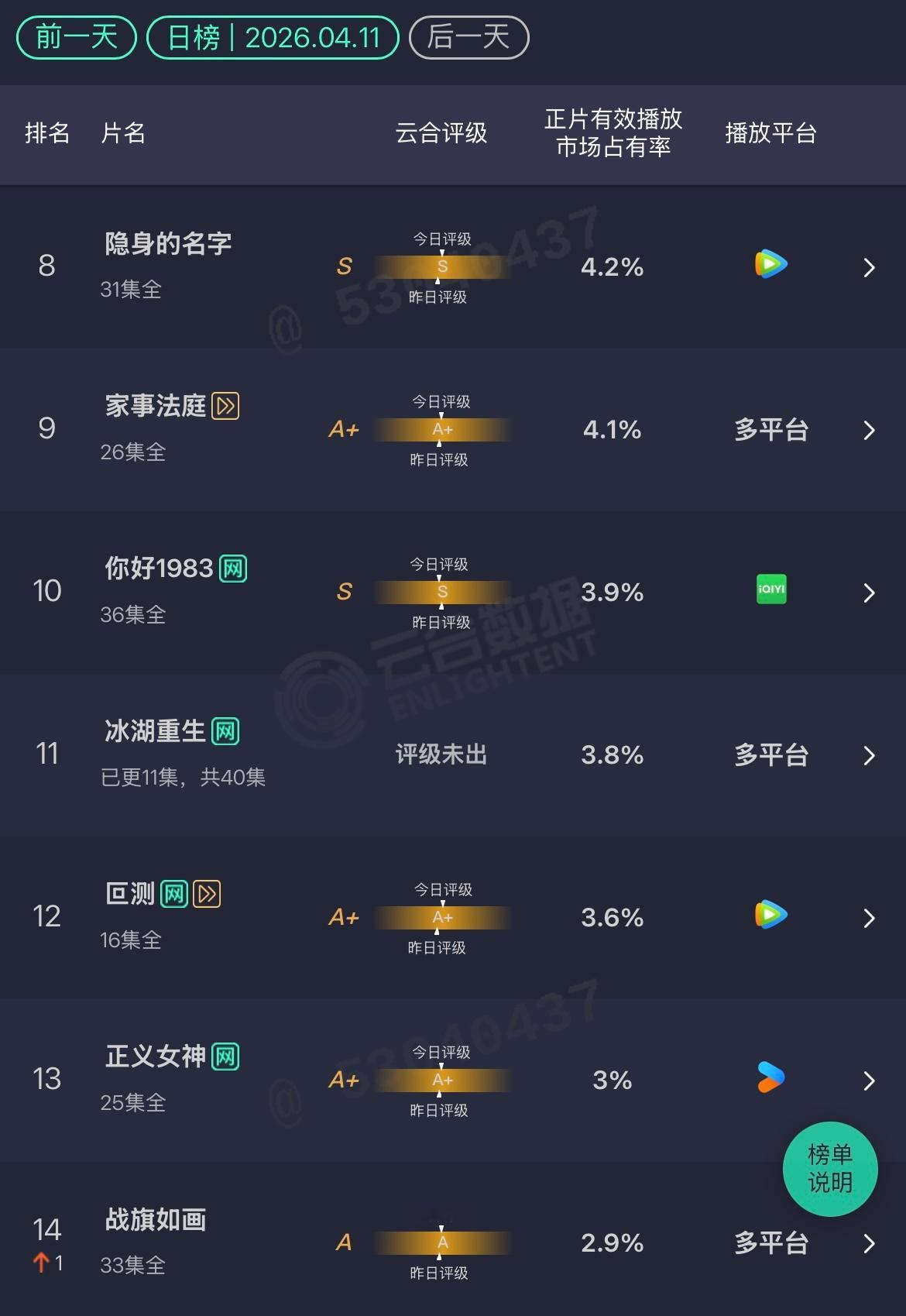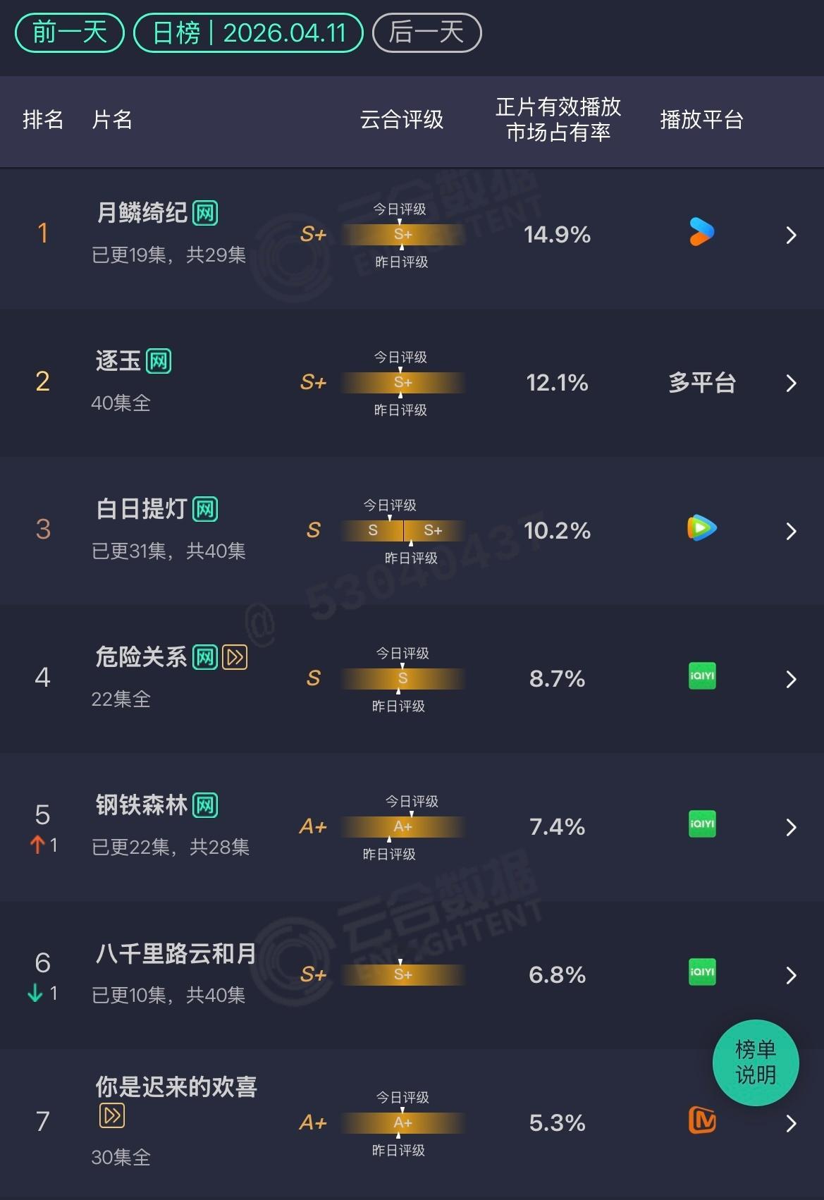 4.12云合月鳞绮纪:14.9白日提灯:10.2%冰湖重生:3.8%每天都跌