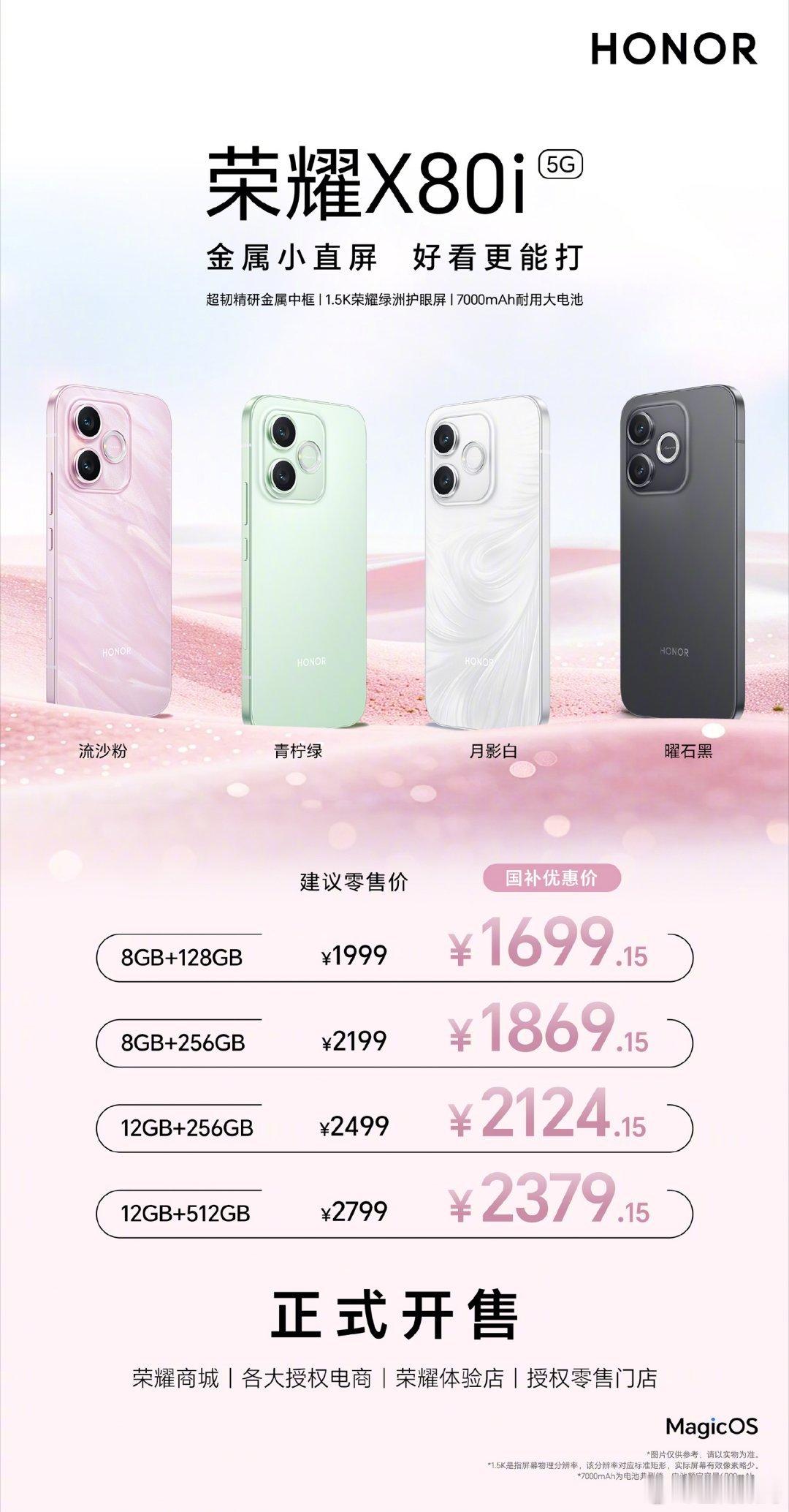 据“荣耀手机”官方微博,荣耀 X80i 正式发售,建议零售价 1999 元起,国补后到手价 1699.15 元起。