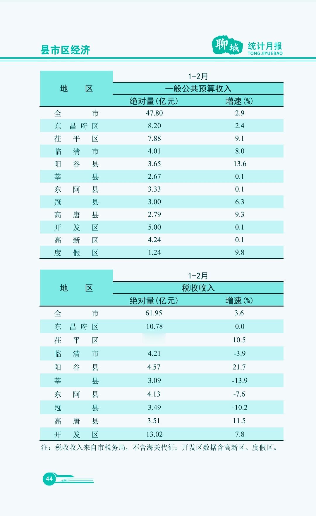 1-2月份聊城市各县(市、区)财政收入揭榜:茌平紧追东昌府 阳谷逆转东阿 高唐反超莘县 据聊城市统计部门最新数据发布显示:2026年1-2月份,全市一般公共预算收入(以下简称财政收入)完成47.8亿元,同比增长2.9%。其中,税收收入完成32.9亿元,增长3.5%;非税收入完成14.9亿元,增长1.5%。 分县(市、区)财政表现来看:总量上,东昌府区完成最高,前2个月达到8.20亿元,继续牢牢捍卫榜首位置;增速上,全部为正增长,以阳谷县两位数增长最为出色。 茌平区以7.88亿元依旧紧随其后,且不断缩小与榜首的差距,由上年同期的0.79亿元拉近到了仅剩下0.32亿元。 开发区与高新区财政收入均实现微增,分别完成5.00亿元和4.24亿元,各自守住第三、四的站位不变。 同期,阳谷县收入增幅唯一实现两位数快速增长,财政总量随之攀升到了3.65亿元,并以0.32亿元的优势逆转东阿县,排名升至第六位。而东阿县则退守第七。 与此同时,增幅同样表现不俗的高唐县,财政收入完成2.79亿元,也以0.12亿元的微弱优势反超莘县,前移一个位次至第九。 对此,您有什么看法呢? 详见附表: