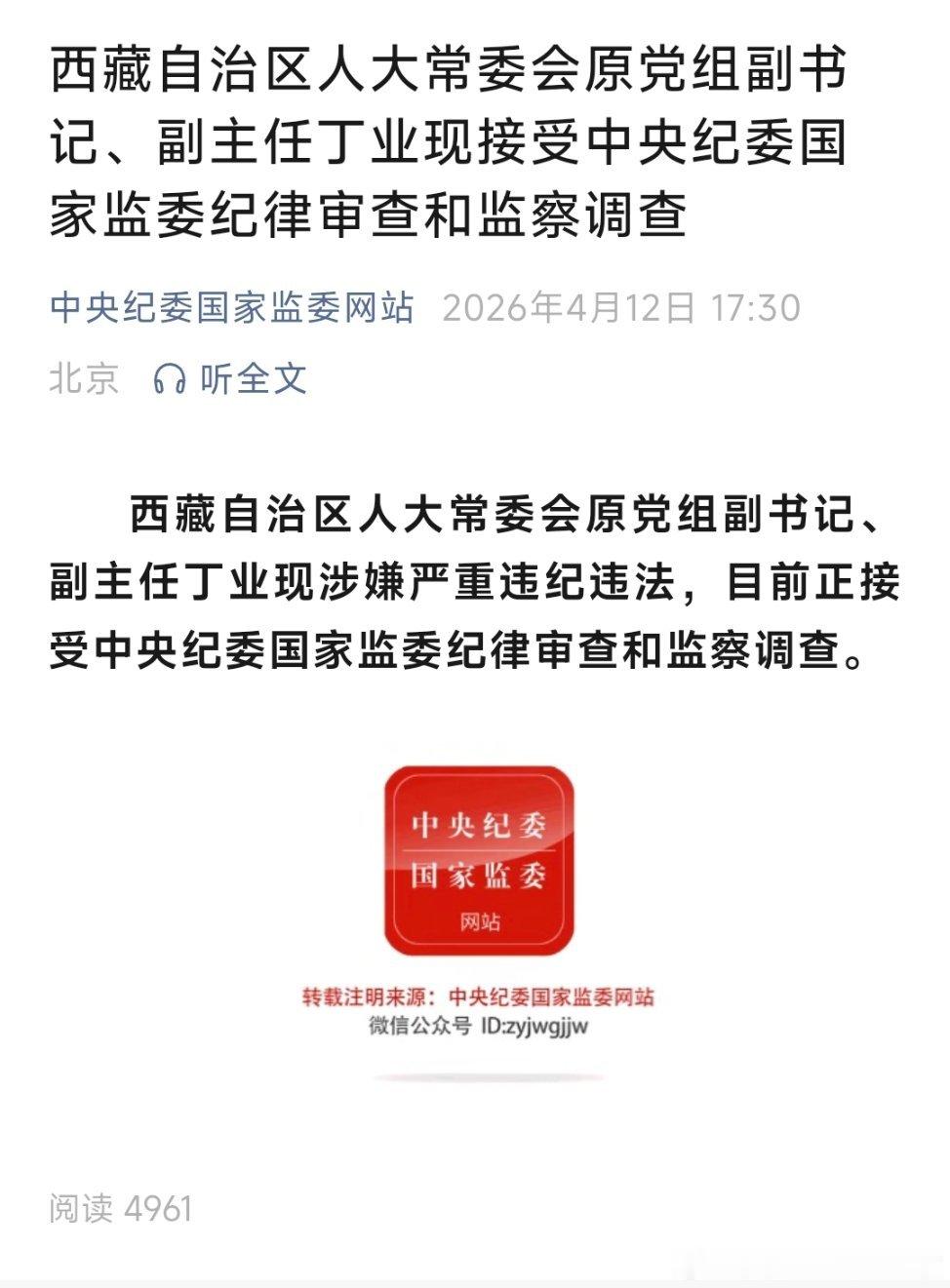 西藏自治区人大常委会原党组副书记、副主任丁业现接受中央纪委国家监委纪律审查和监察调查!
