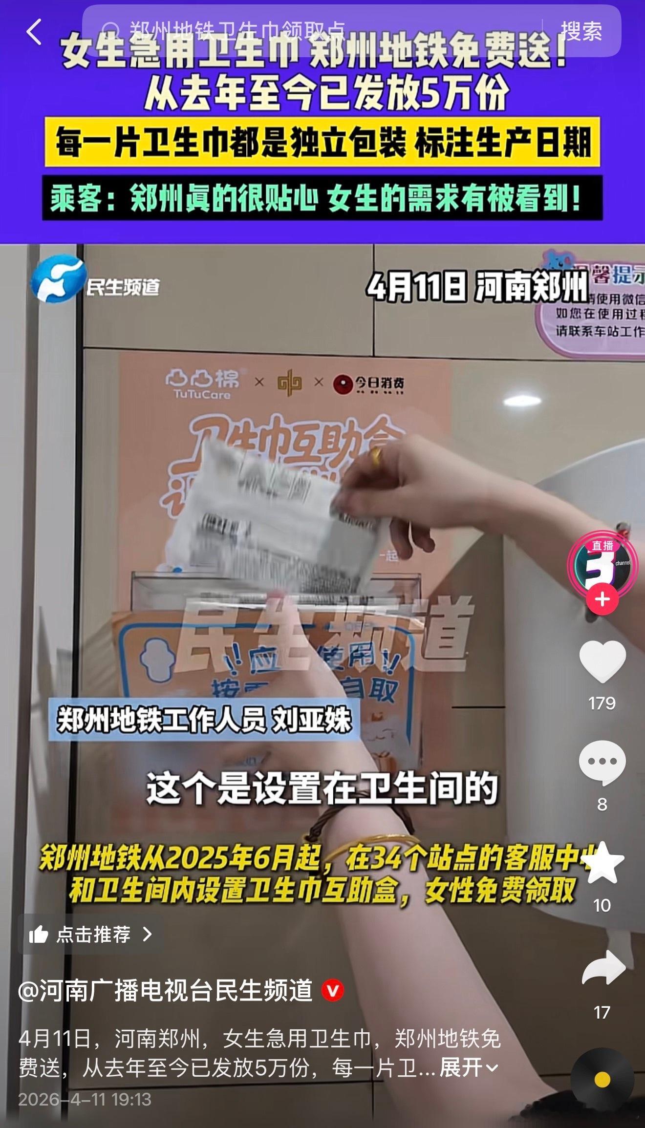 河南郑州地铁站为女性提供免费卫生巾,从去年至今已发放5万份