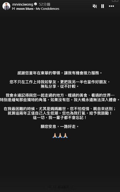 王贤志悼念何超蕸王贤志曾与何超蕸出任东华三院董事局成员,王贤志得悉何超蕸死讯,在IG限时动态发文悼念:“感谢您当年在东华的带领,让我有机会接力服务。您不只在工作上待我如挚友,更把我另一半也当作好朋友,无私分享,从不计较。我会永远记得与您一起走过的地方、尝过的美食、看过的世界⋯特别是缅甸那些独特的角落,如果没有您,我大概永远无法深入体会。在我最困难的时候,尤其是妈妈离世,您不怕疫情、亲自来送别;就算这两年正值自己人生低潮,您也为我打气,给予我鼓励!这一切,我一辈子都不会忘记!愿您安息,一路好走。”
