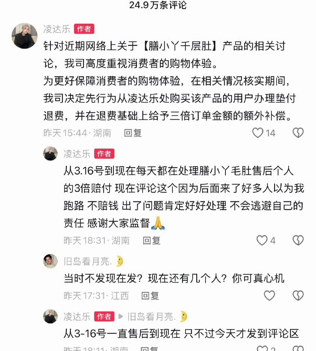 鹿哈,正式回应。 4月12日,之前被315曝光卖双氧水泡过的毛肚的网红鹿哈,突然冲上热搜,当时事情被曝光后,鹿哈一直没有出面回应,大家都在怀疑他是不是跑路了。 但这一次,鹿哈直接给出回应。 原来他这段时间以来,一直在做3被赔付的售后服务处理,因为他卖的毛肚,售后是承诺假一赔三,然而315曝光了产品的制造过程,双氧水浸泡,还有员工的不卫生行为,都给这一款毛肚带来了负面的影响。 而且,这款产品是鹿哈的爆款单,也为鹿哈赚了不少钱,但如今产品售后出现问题,鹿哈面临着假一赔三的售后赔付,鹿哈也没有跑路,而是一直在做这件事。 有网友也放出消息,确实收到了鹿哈的三倍赔付。 不得不说,鹿哈卖的产品出了问题,但他选择承诺的假一赔三,因此如今口碑不仅没有崩塌,反而信誉变得更好,敢作敢当成了鹿哈做事风格。 谁敢想,都以为要人设崩塌的鹿哈,居然这么快就反转了。