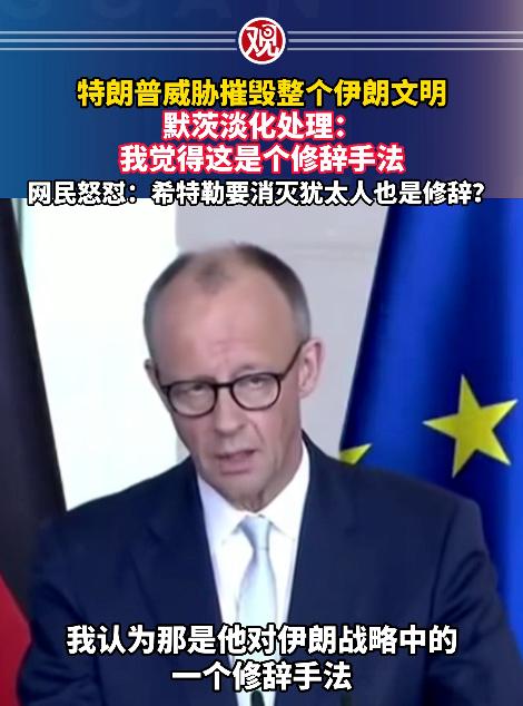 真让人火大!德国总理默茨面对特朗普扬言摧毁伊朗文明的极端言论,居然轻描淡写称只是 “修辞手法”,这番表态瞬间惹怒全球网友,骂声一片。 时间回到2026年4月7号,特朗普在自己的社交平台上,发了一条让人浑身发毛的动态,里面写着:“今晚,整个文明将消亡,永无复兴之日”。 这条动态一曝光,瞬间在全世界掀起了轩然大波,伊朗方面也没惯着他,直接硬气回怼,明确表示“克制到此为止”,要是特朗普真敢动手,他们就直接反击美国和其盟友的相关设施。 可最让人膈应的一幕来了,当有人问德国总理默茨,怎么看待特朗普这番威胁时,他居然轻描淡写地打圆场,说这只不过是特朗普的“修辞而已”,大家没必要太较真。 就是这句轻飘飘的辩解,直接点燃了全网的怒火,尤其是德国本土的老百姓,当场就怒怼回去:“当年希特勒说要消灭犹太人,难道也是所谓的修辞吗?” 懂的人都知道,在德国,纳粹大屠杀是刻在骨子里的禁忌,是绝对不能触碰的历史红线,可默茨倒好,把毁灭一个文明的致命威胁,说得跟随口闲聊的话术一样,这不是在践踏历史,又是什么? 说白了,特朗普的那些狂言,根本不是随口吹牛,就是明晃晃的威胁,目的无非就是想逼伊朗低头服软,可这种不管老百姓死活的做法,早就突破了做人的底线,而默茨的辩解,更是不负责任到了极点,说白了就是怕得罪美国,想靠着和稀泥蒙混过关。 其实这事说白了一点都不复杂,根本没有什么所谓的“修辞”,全是关乎无数人命运的大事。 特朗普的狂妄自大,默茨的敷衍了事,都在提醒我们:有些底线绝对不能碰,但凡敢为极端言论开脱,终究会被所有人唾弃,被历史狠狠教训! 信息来源:观察者网《特朗普威胁摧毁整个伊朗文明,默茨淡化处理:我觉得这是个修辞手法,网民怒怼:希特勒要消灭犹太人也是修辞?》2026-04-10